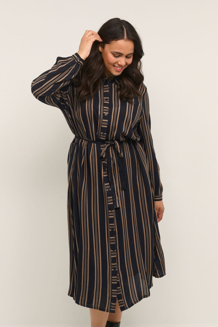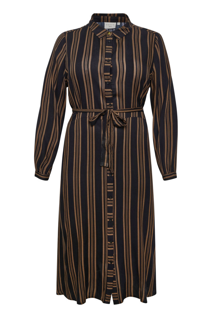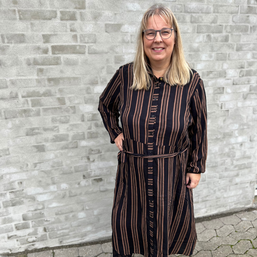 Wauwwww..., -Vi er helt vilde med den her lækre sag fra Kaffe Curve. En super skøn skjortekjole i et vildt flot stribet mønster i sort og den lækre dybe mørkebrune farve kaldet "Java"...