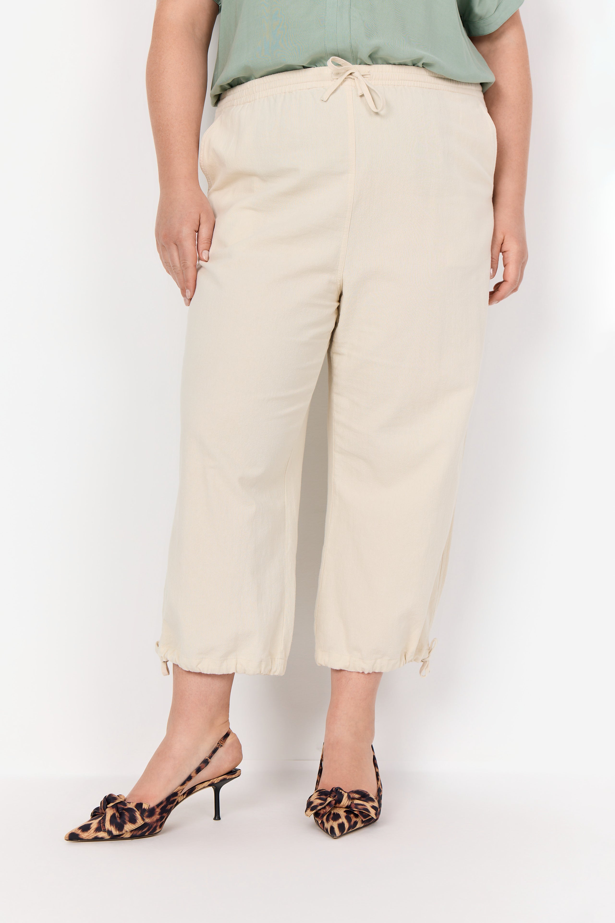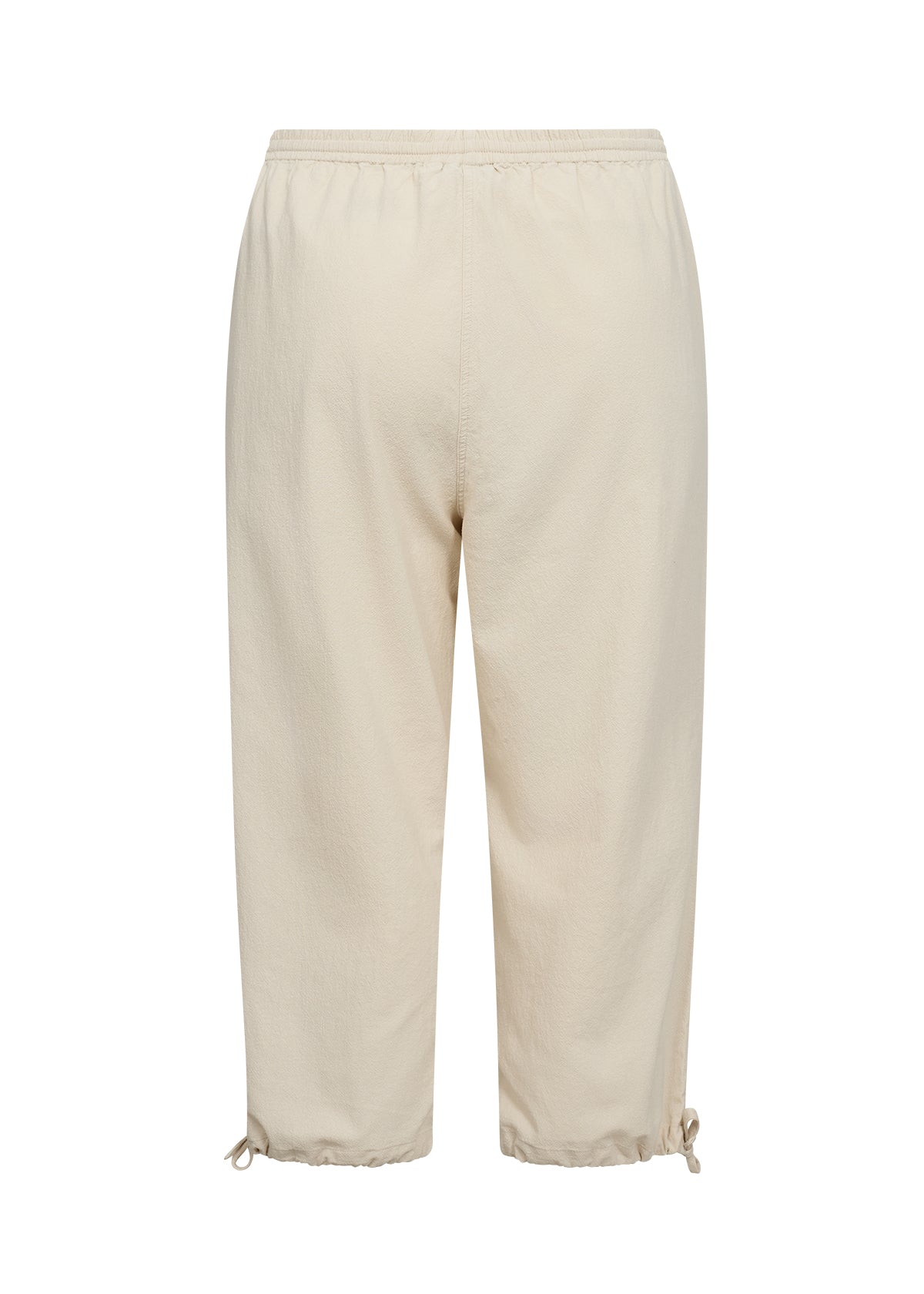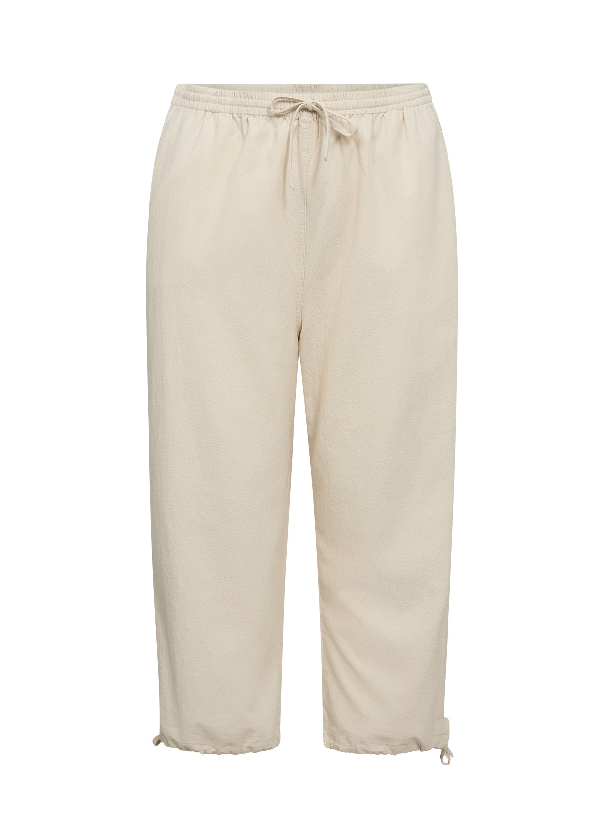 Bukserne har en justerbar talje, skrå sidelommer og en justerbar kant forneden.