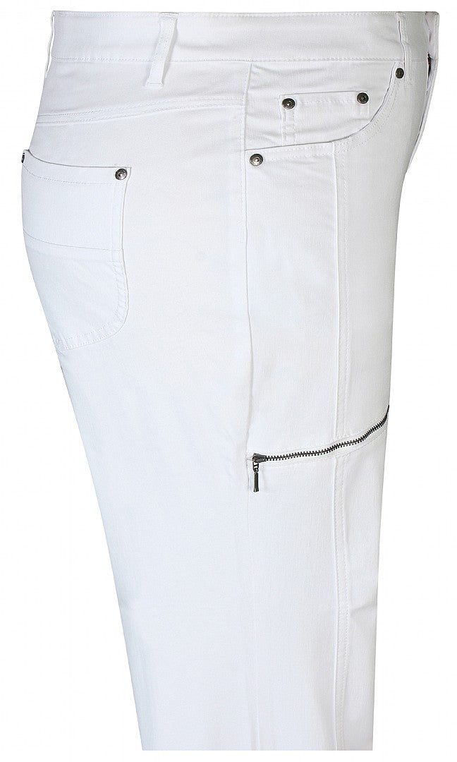 Buksen har fast talje men med elastik så de evt. kan spændes ind. Den har bæltestropper og 5 lommer. Modellen er en "Step Fit" med lige ben. På låret er der den her smarte detalje med lynlås - der bare lige gi'r det der ekstra en til denne flotte klassiske buks..