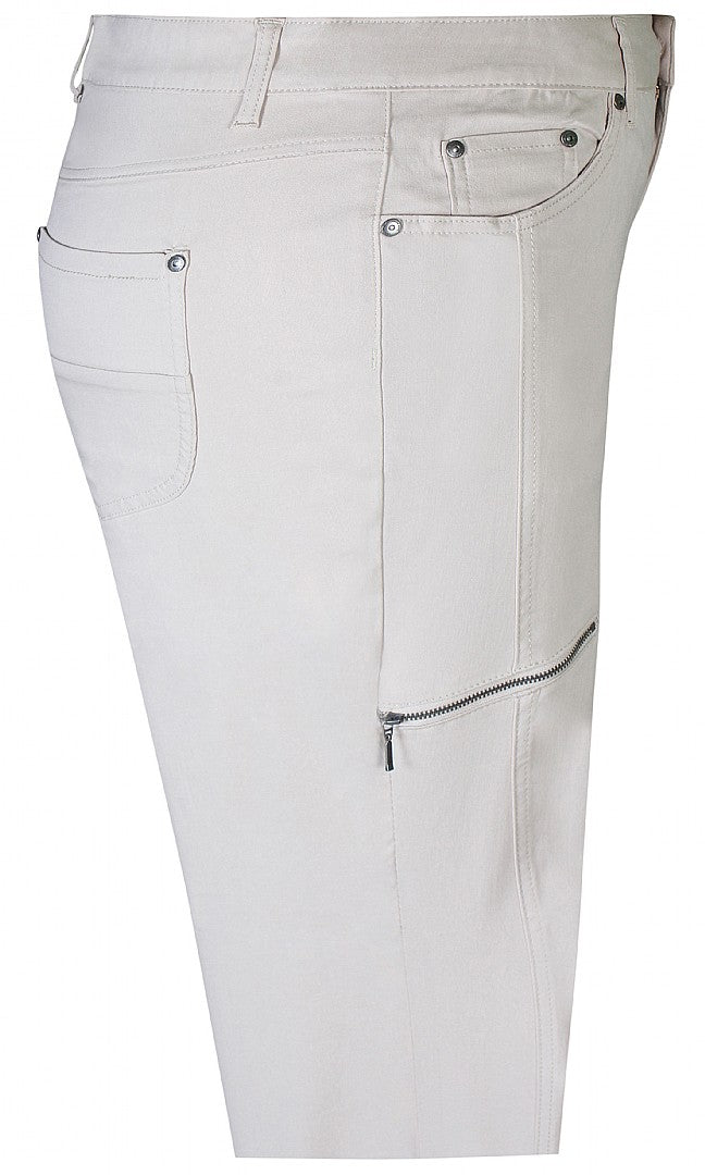 Buksen har fast talje men med elastik så de evt. kan spændes ind. Den har bæltestropper og 5 lommer. Modellen er en "Step Fit" med lige ben. På låret er der den her smarte detalje med lynlås - der bare lige gi'r det der ekstra en til denne flotte klassiske buks..