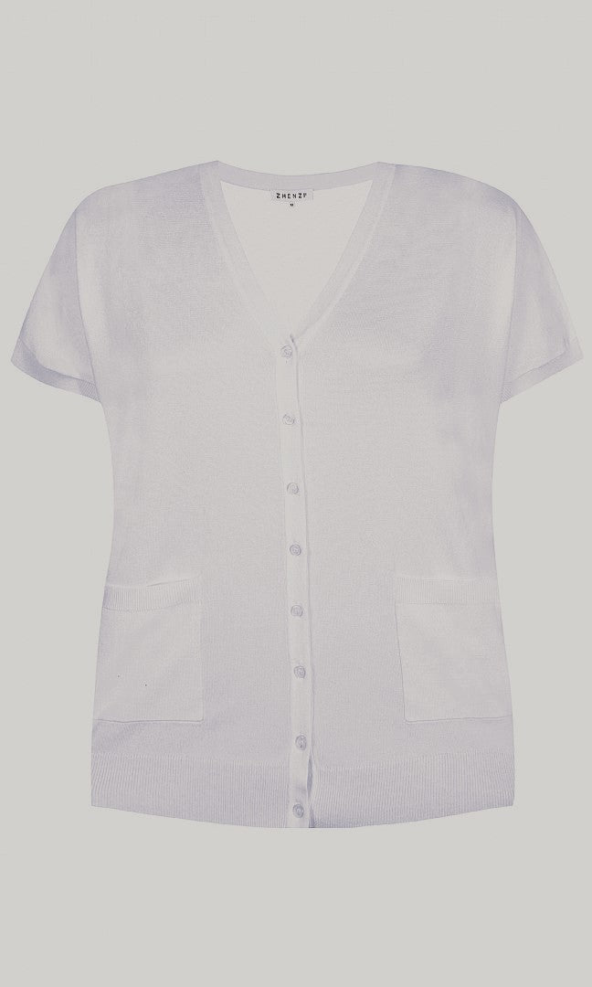 Cardiganen er "kort", den har knapper hele vejen ned, let v-udskæring, korte ærmer og ribkanter ved ærmeåbning samt forneden og så har den lommer foran..