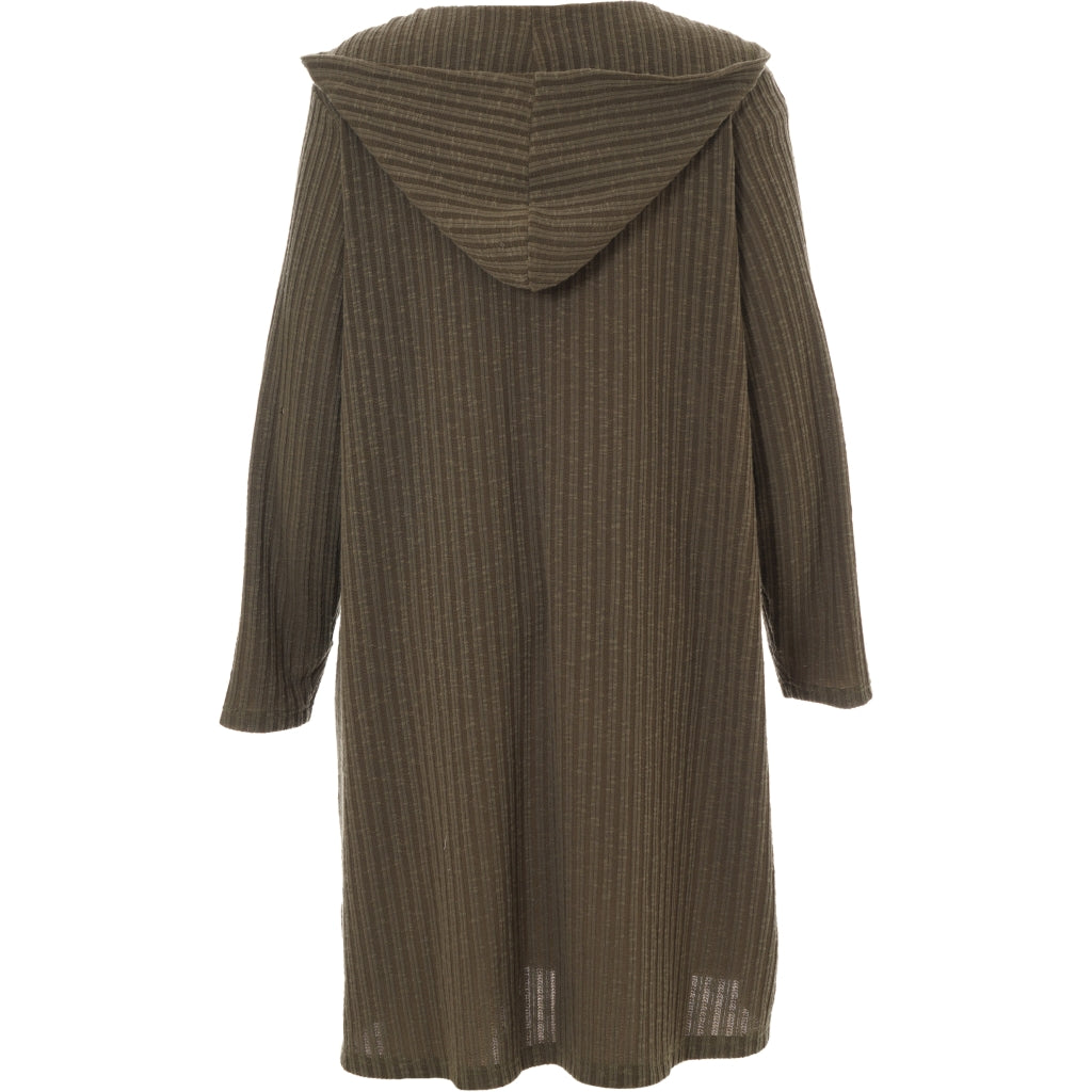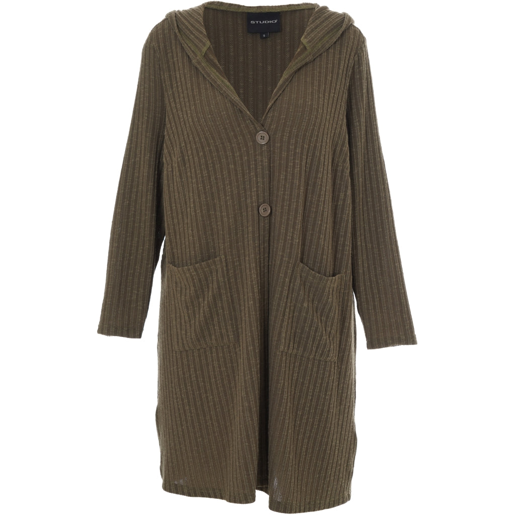 Stilfuld, ensfarvet cardigan i elastisk polyester. Cardiganen er løstsiddende med knaplukning. Stilen har en hætte og vedhæftede lommer.