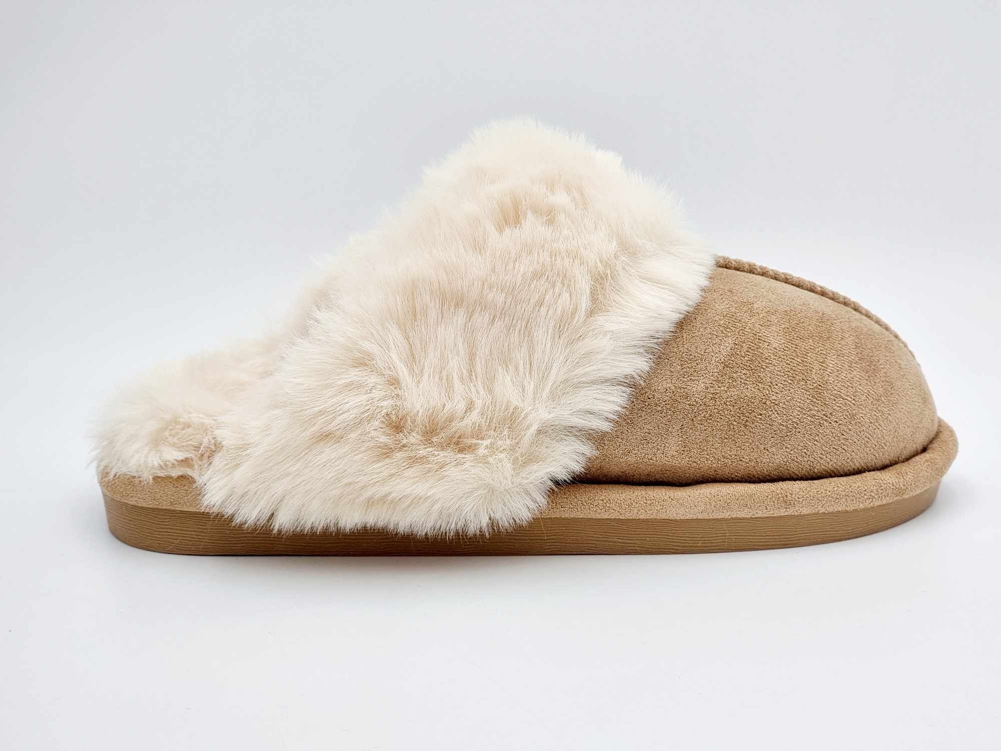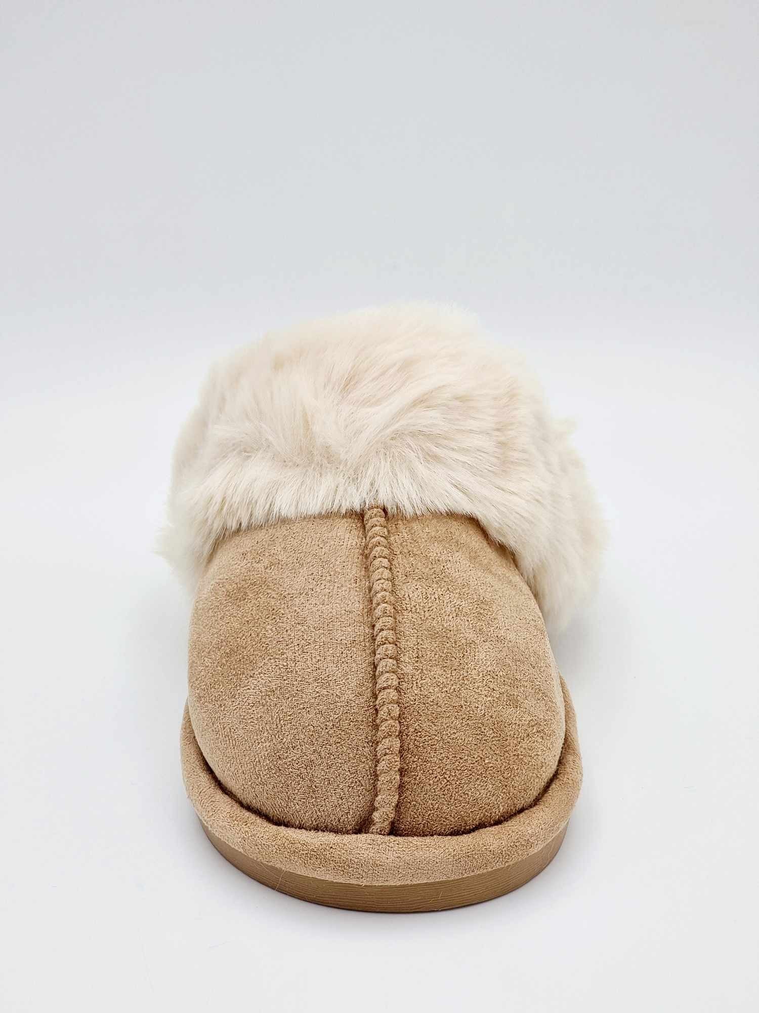 Hjemmesko med imiteret ruskind og fake fur, sålen er fast.
