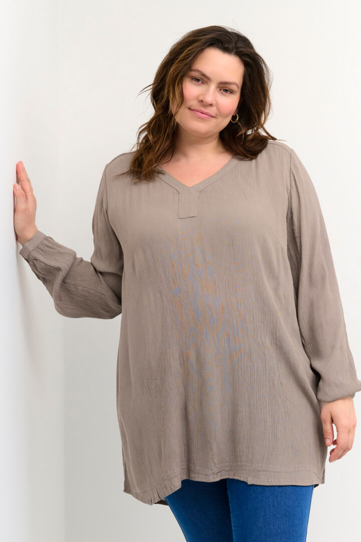 Lækker tunika i den lækre crepet viskose fra Kaffe Curve, og se lige en farve - "Fallen Rock" en helt fantastisk sandfarve..