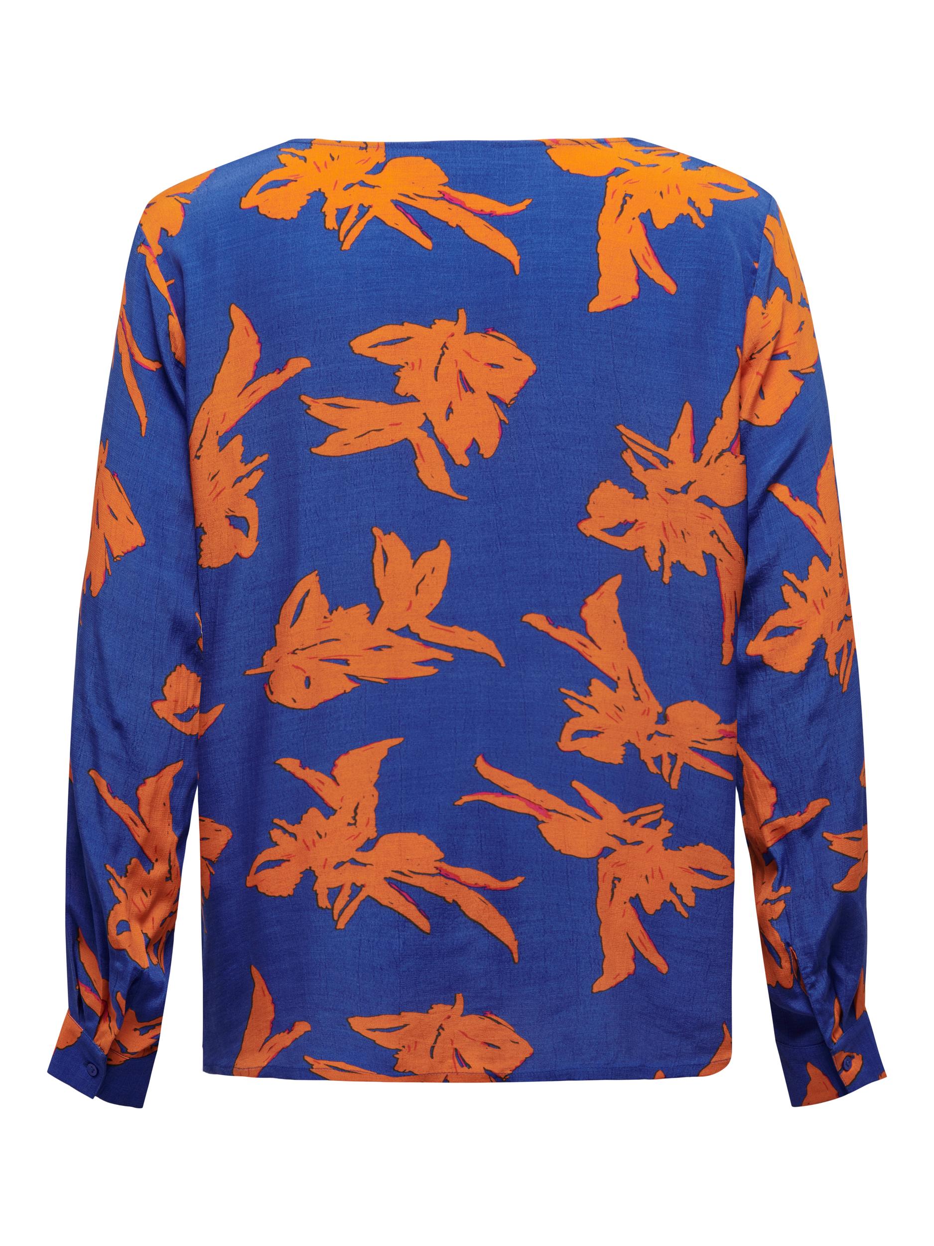 Blusen har en V-udskæring og lange ærmer som afsluttes med en manchet..
