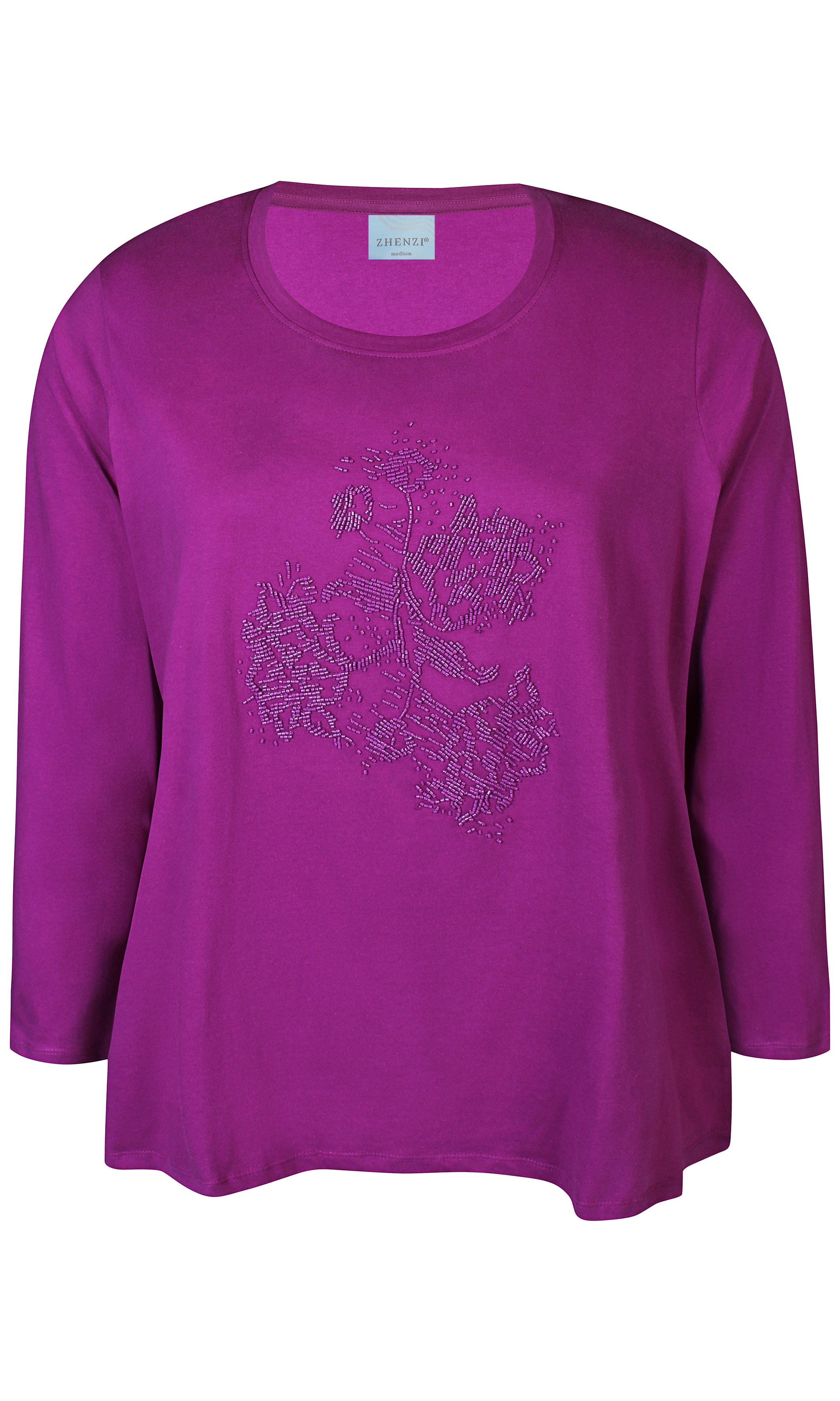 Bluse med rundhals og perletryk på forstykket. 100% bomuld Mærke Zhenzi Vare nr. 200535 R14 Lilla S 42/44... Læs mere og se produktmål