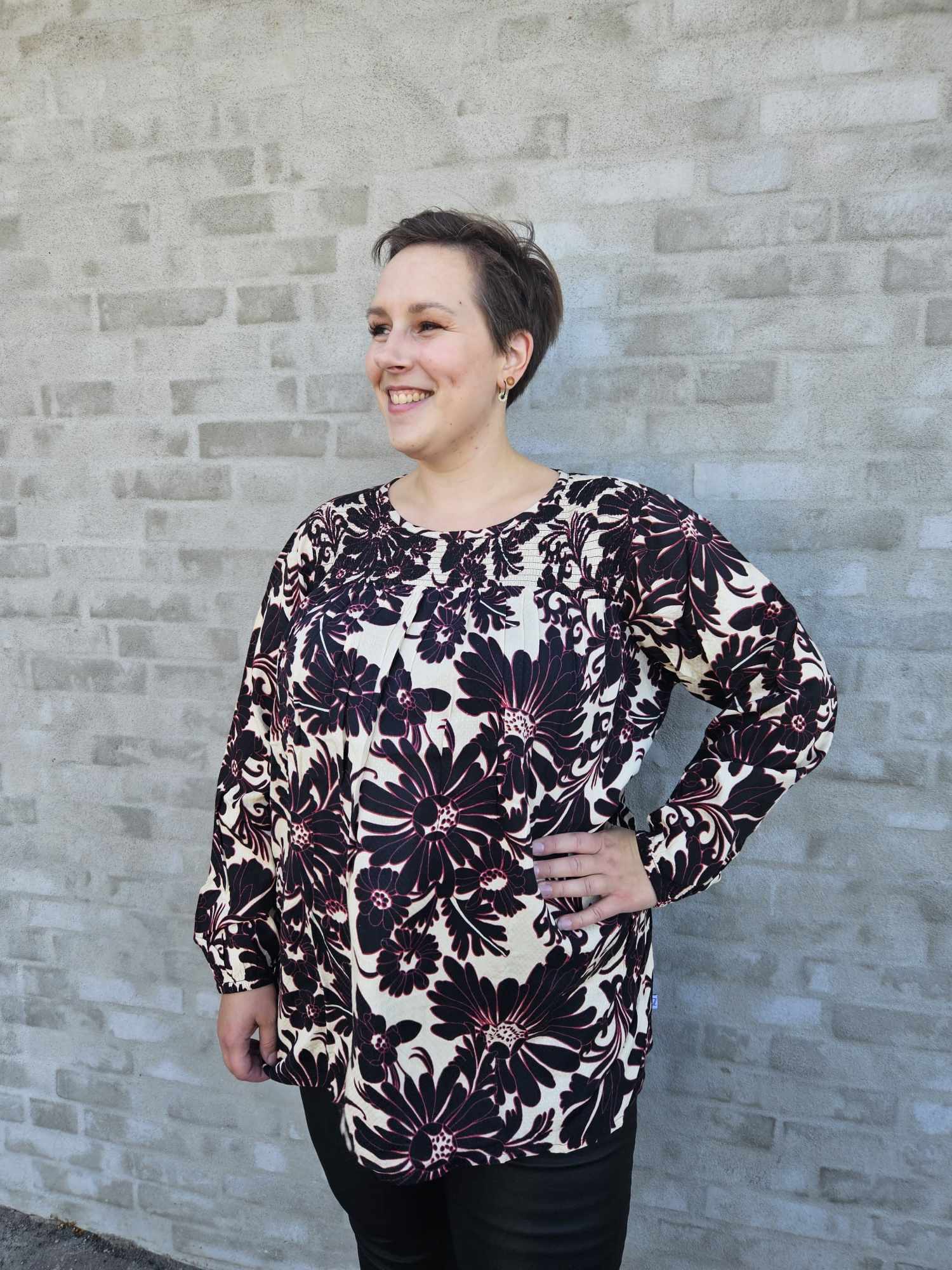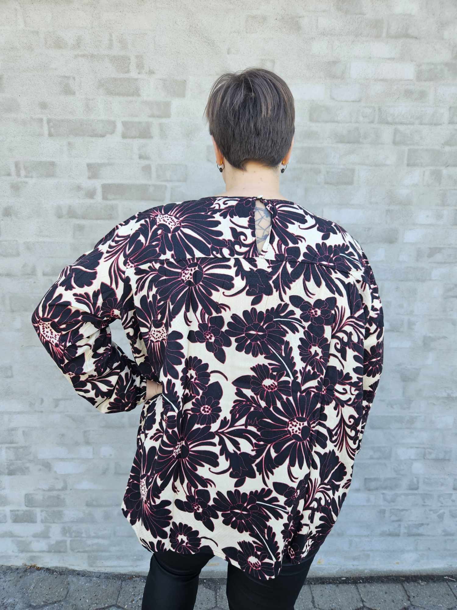 Bluse med smok detalje i halsen, knap lukning i nakken.