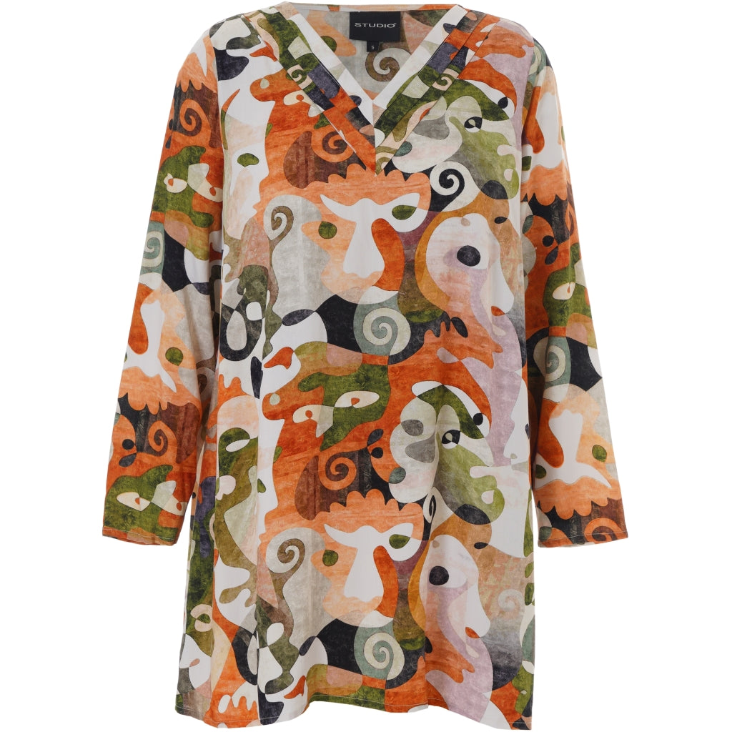 Farverig tunika med kunstnerisk og abstrakt tryk. Tunikaen har lange ærmer og V-udskæring med læg, der understreger V-detaljen.