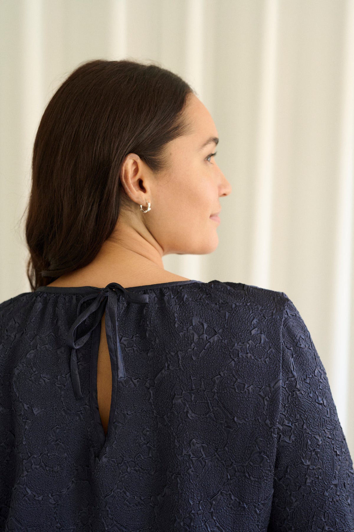 Bindebånd i nakken. Fint satinbånd i halsen.