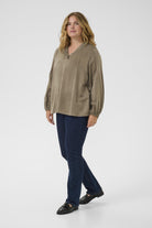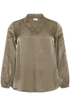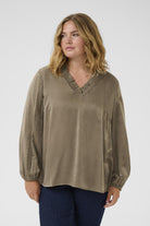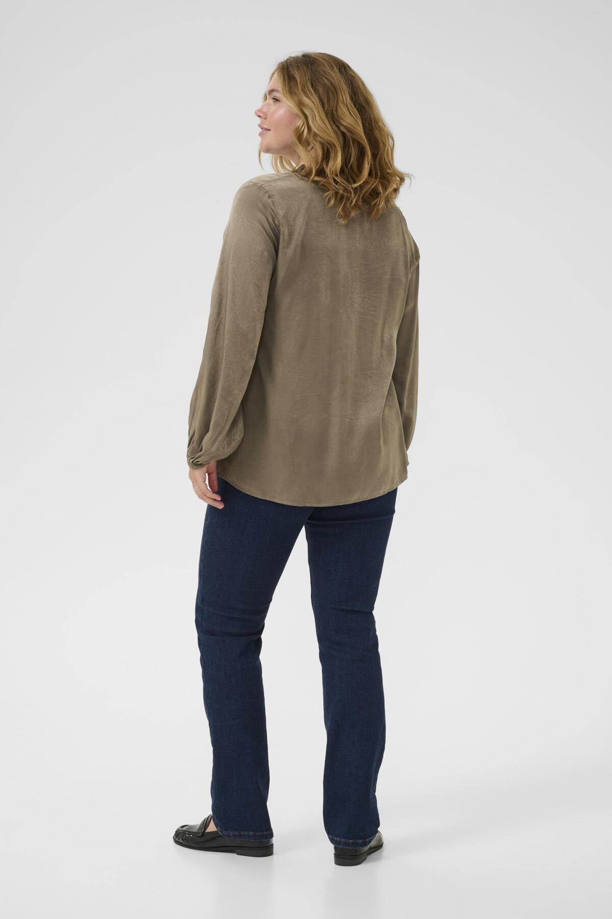 Blusen har den finest V-hals med elastik i kanten. Lange ærmer med elastik kant, går ud i A-facon.... Læs mere og se produktmål