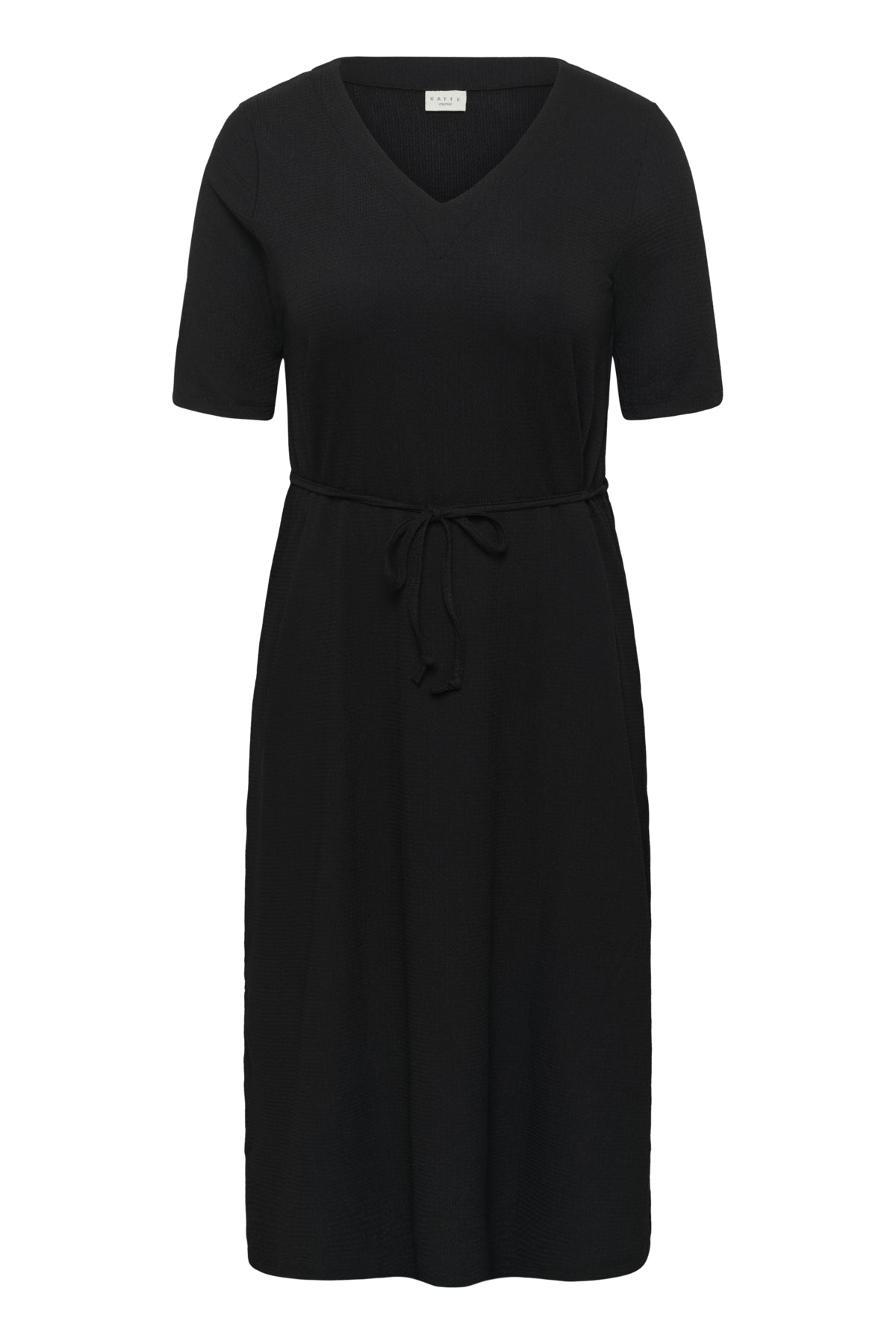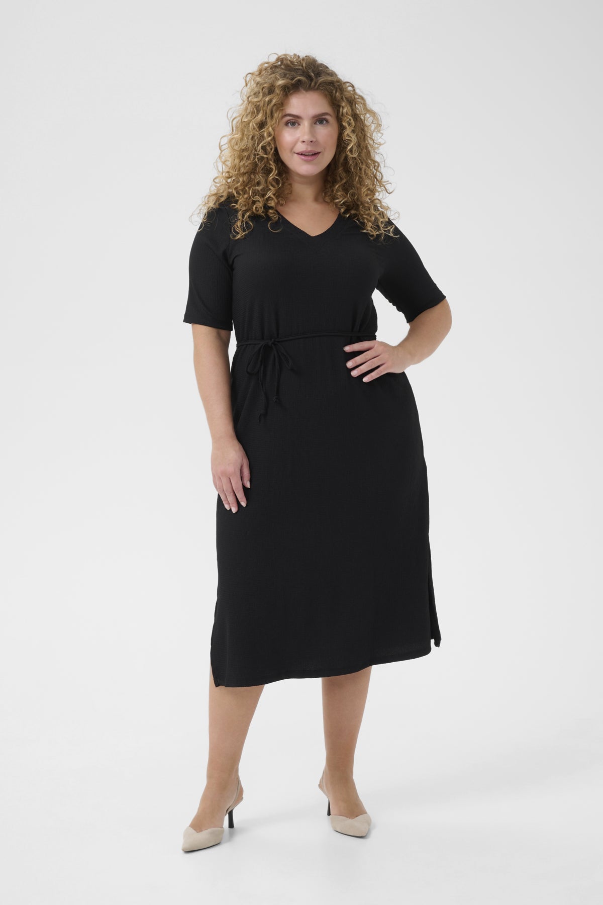 Kjolen har korte ærmer, en feminin V-hals og praktiske sideslidser, der tilføjer et moderne touch. Det valgfrie bindebånd i taljen giver mulighed for at justere kjolens pasform efter behov.