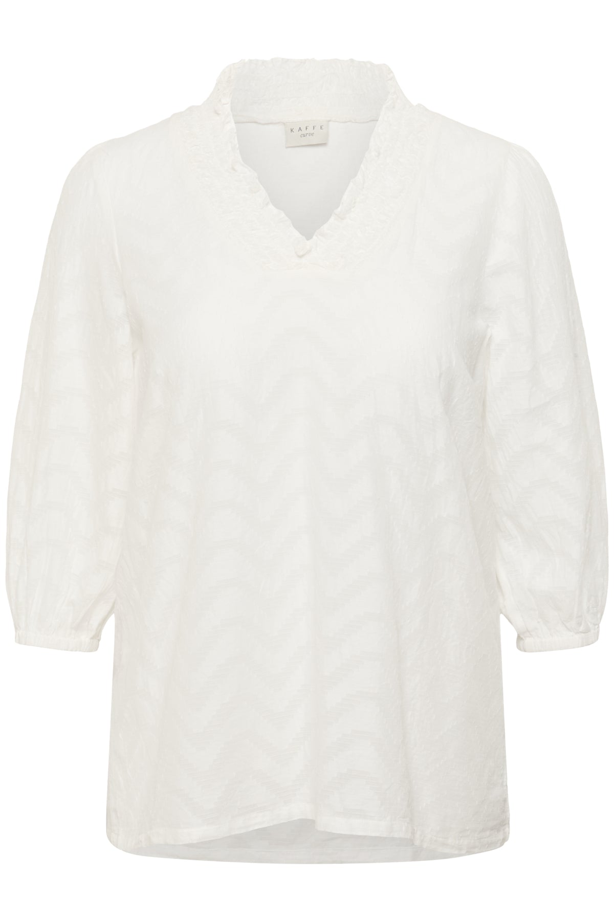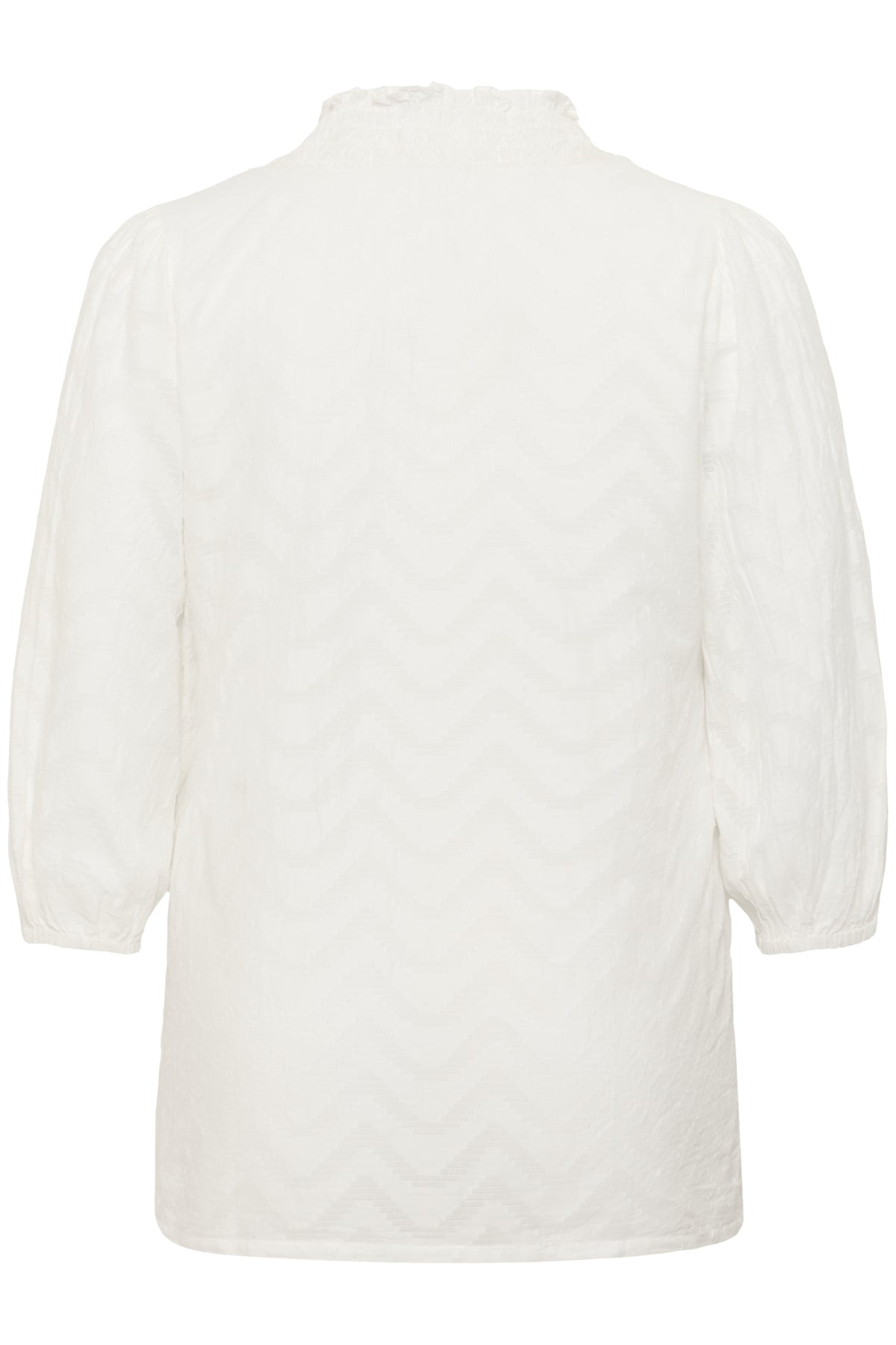 Denne hvide bluse præsenterer et subtilt zigzag mønster, der tilføjer dybde og karakter til det enkle design. De 3/4 lange ærmer er både praktiske og flatterende, ideelle til overgangs vejr eller en aften ude.