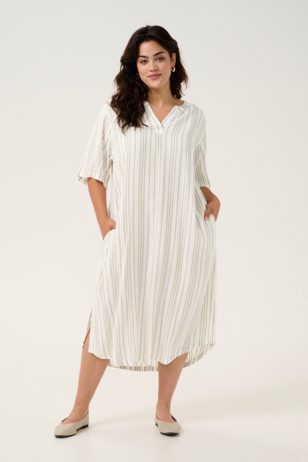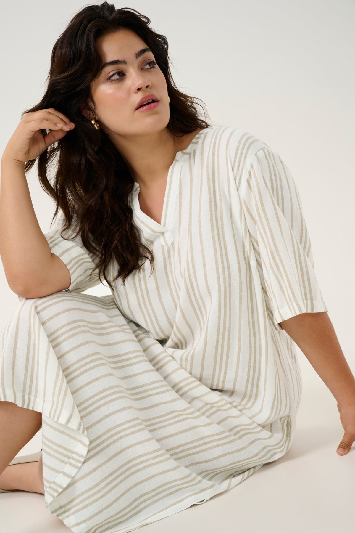 Kjolen er med "stolpe-lukning", korte ærmer, en lille slids forneden i hver side, og så har den også lommer i siden...