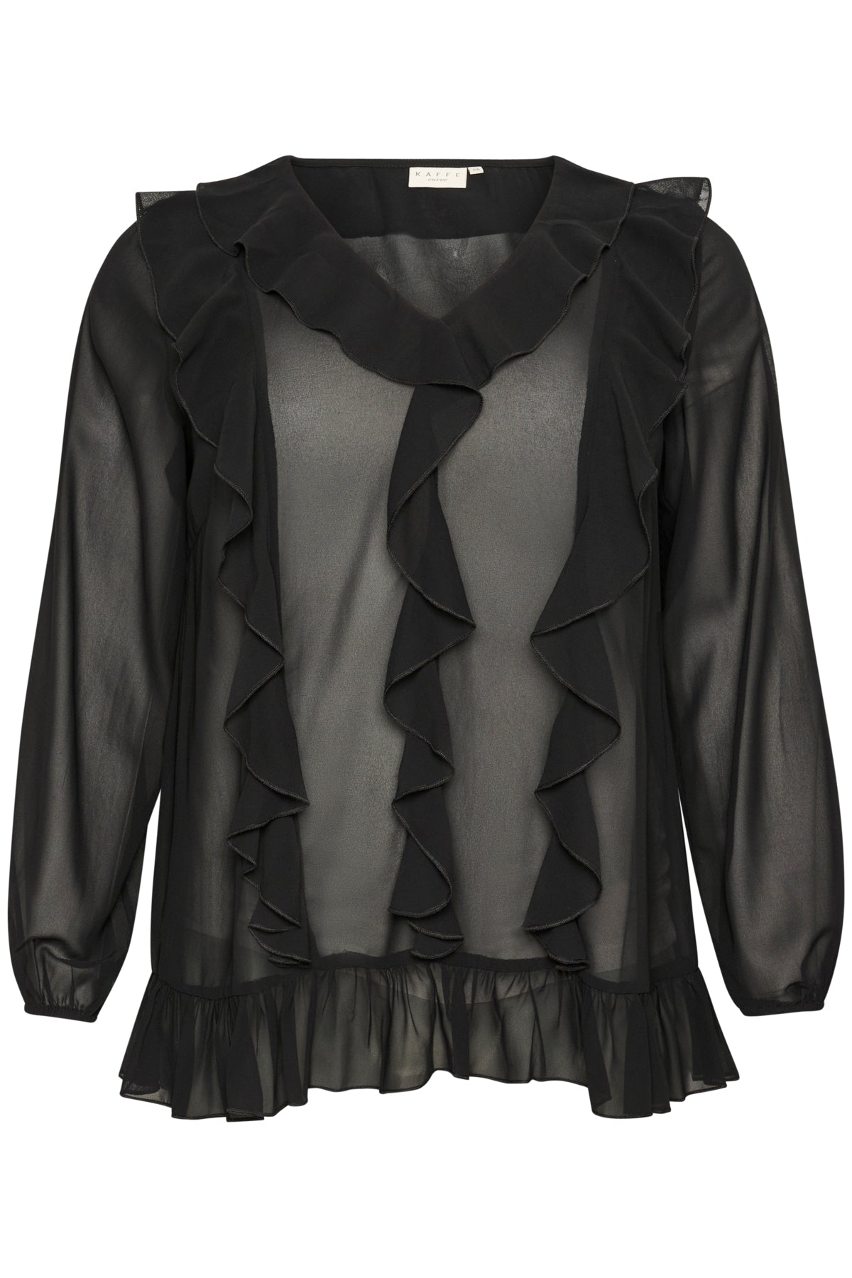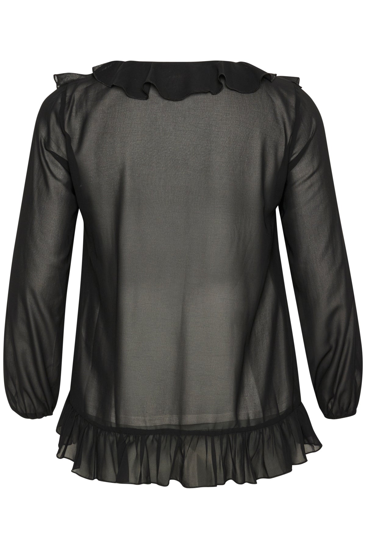 Smuk bluse i mesh med flæser på forstykket og i kraven.