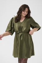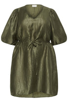 Kjolen har en flot blank overflade. V-hals og puf ærme med elastikkant. Bæltet er løs og den kan... Læs mere og se produktmål