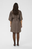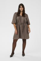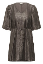 Kjolen har en flot blank overflade. V-hals og puf ærme med elastikkant. Bæltet er løs og den kan... Læs mere og se produktmål