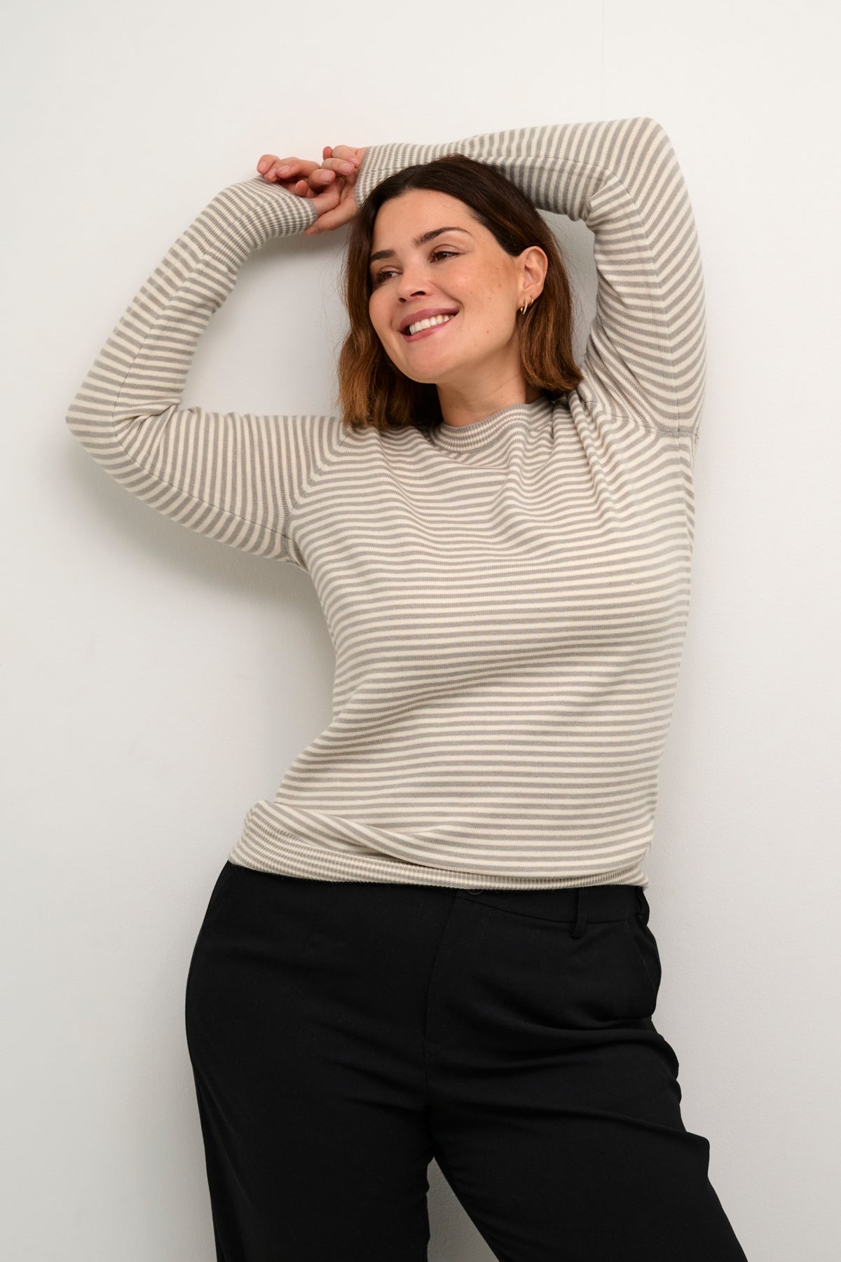 Dejlig strik med rund hals og striber. 50% acry, 28%polyester, 22% neylon Mærke Kaffe curve Vare nr. 10582708... Læs mere og se produktmål