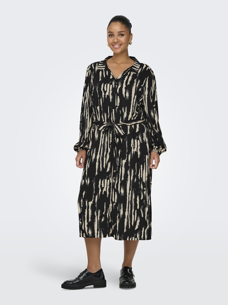 Gennem knappet kjole med krave og bælte.