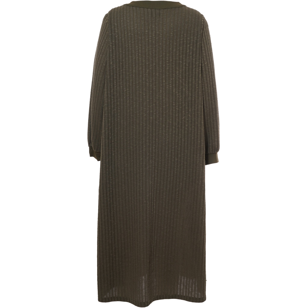 Stilfuld og ensfarvet, lang strikkjole med lange ærmer og generøs O-udskæring. Manchetter og O-udskæringstape er i jerseykvalitet.