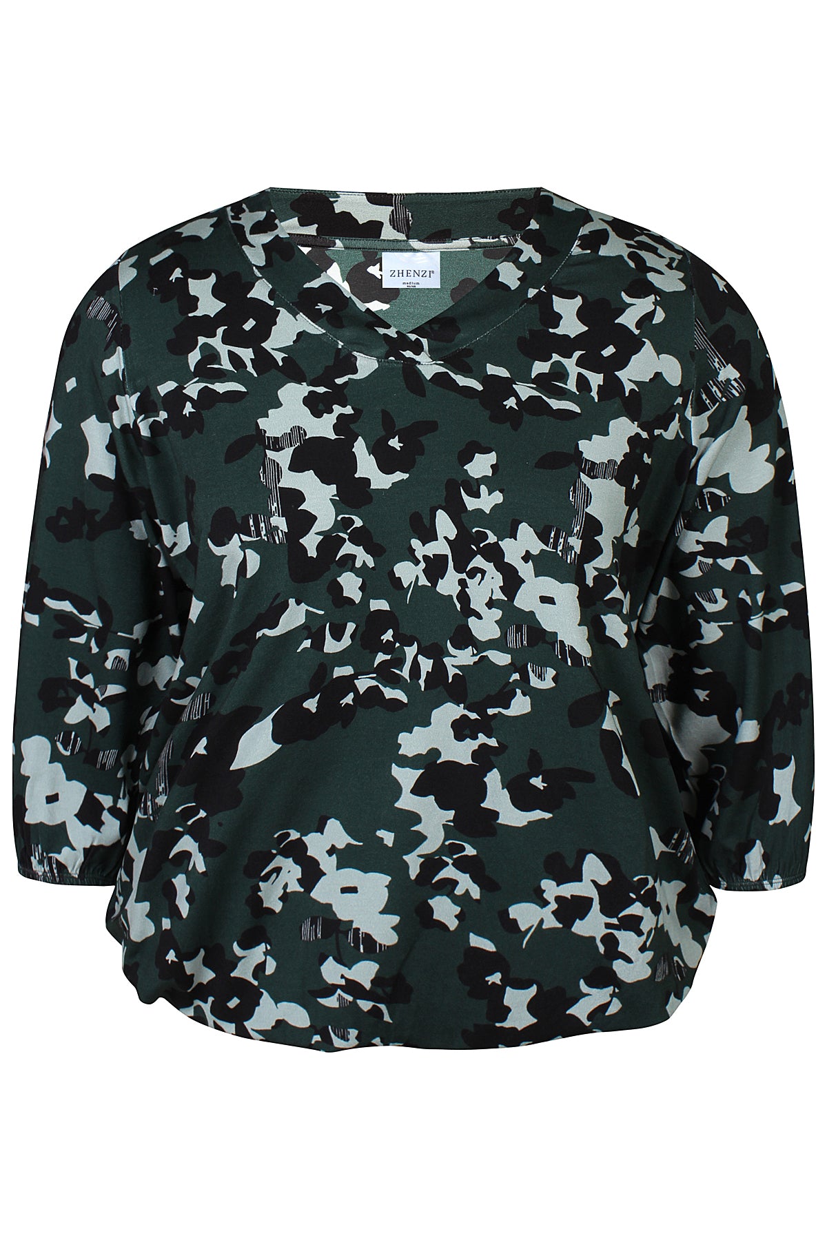 V-hals. 3/4 ærme med elastik i kanten og i taljen.