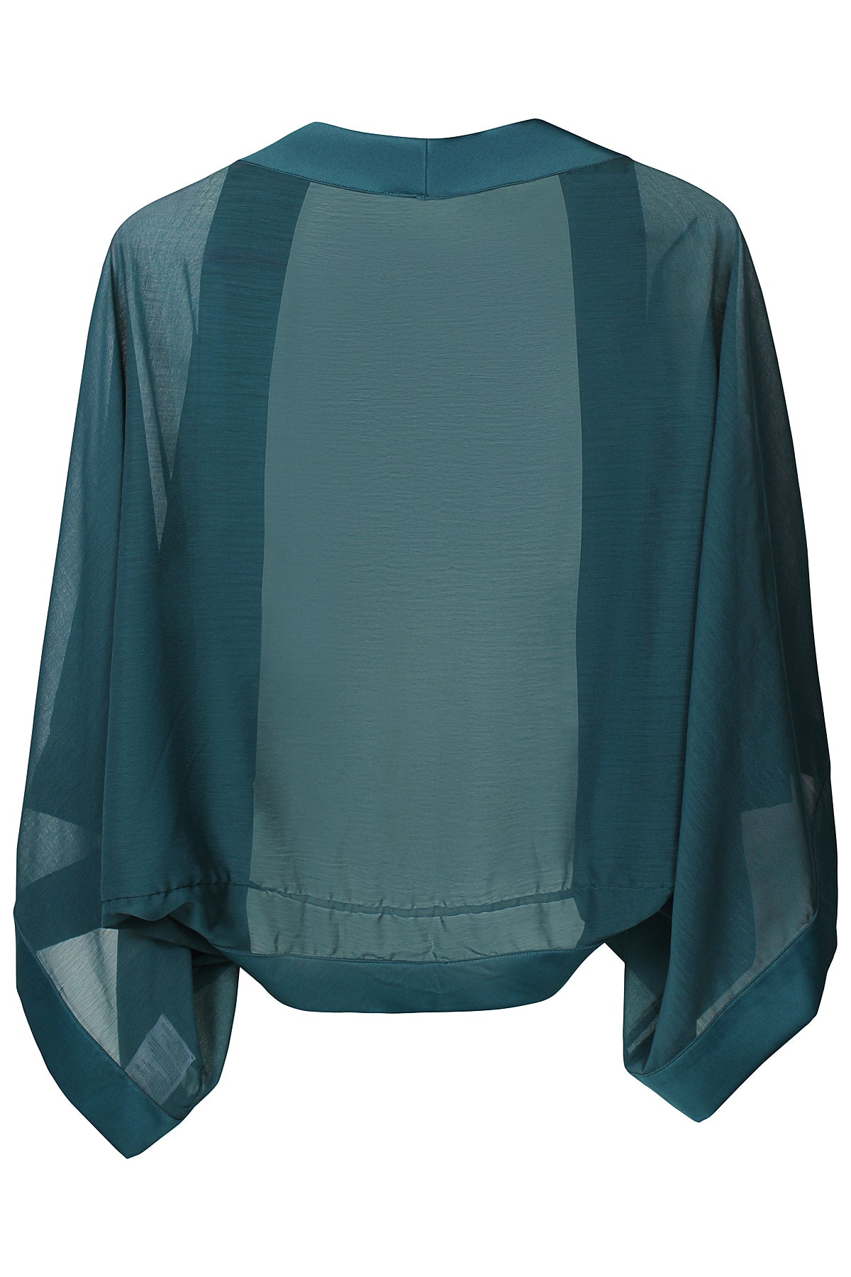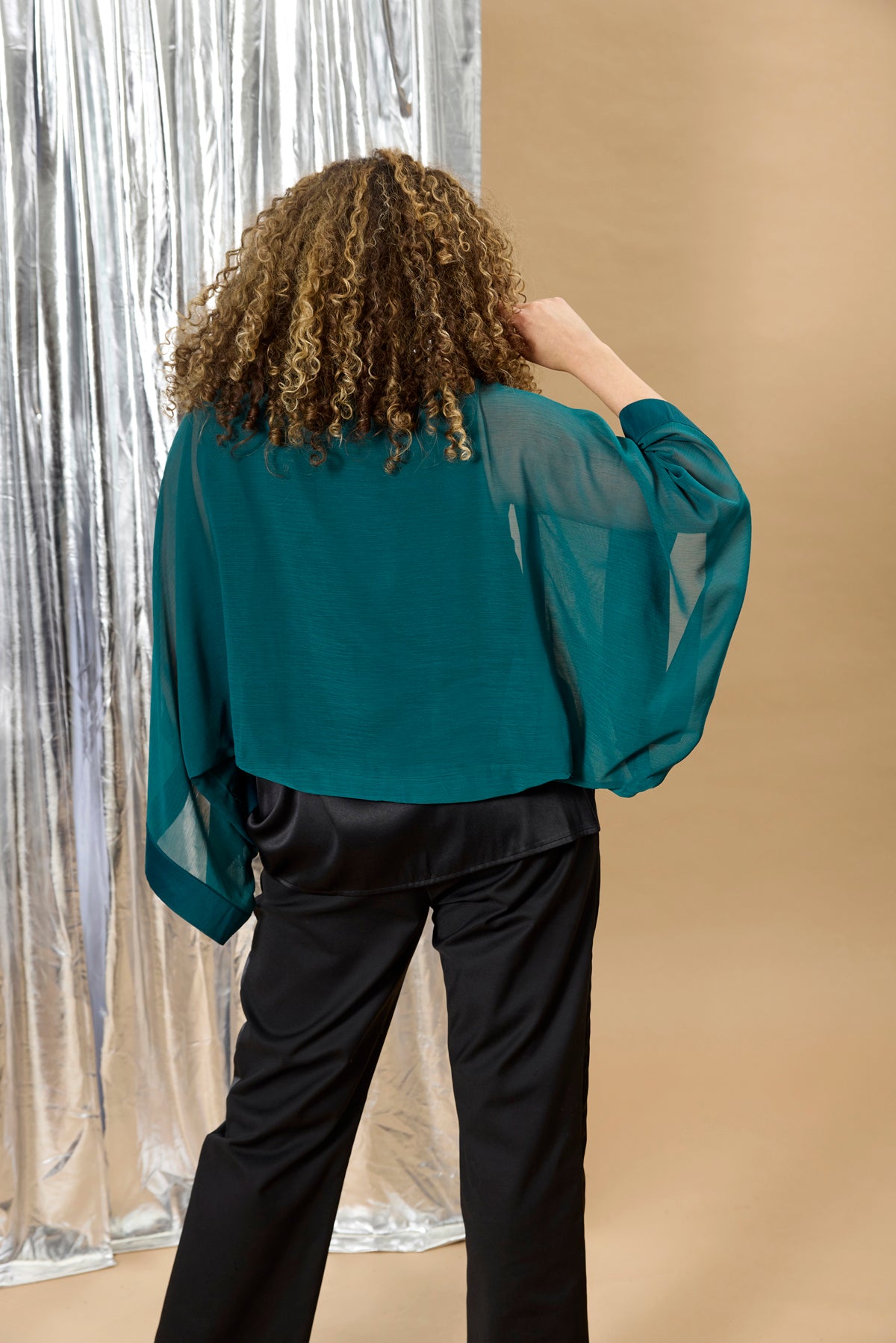 Flot og feminin bolero i let chiffon med elegante satin-kanter og 3/4 lange ærmer. Den er perfekt at bruge over bluser eller kjoler og tilføjer et sofistikeret touch til ethvert outfit. Ideel til både festlige lejligheder og når du bare vil give dit look lidt ekstra kant og elegance.