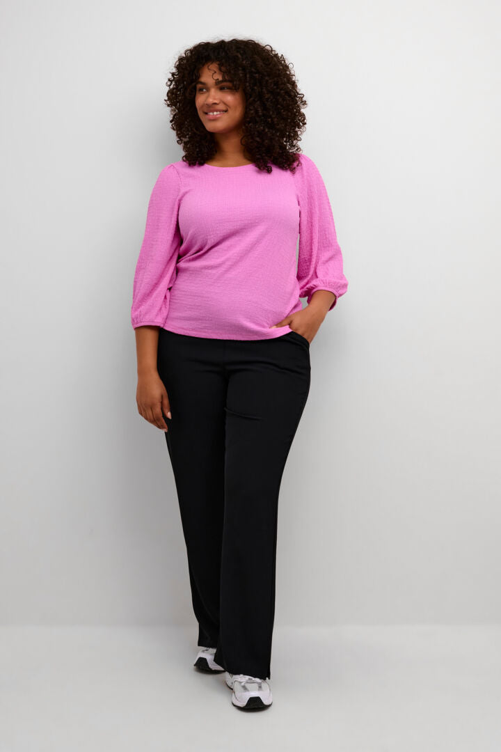 Blusen som har det her lidt a'la elastik stof /smock over sig, den er med rund udskæring, 7/8 lange puffet ærmer der afsluttes med en lille elastik.. Prøv at style den til et par jeans og en bikerjakke, eller hvad med et elegant look med en mørk buks og blazer...