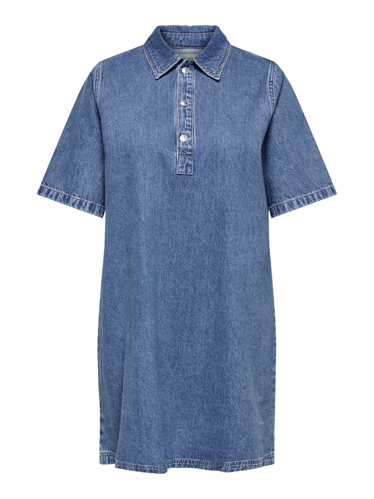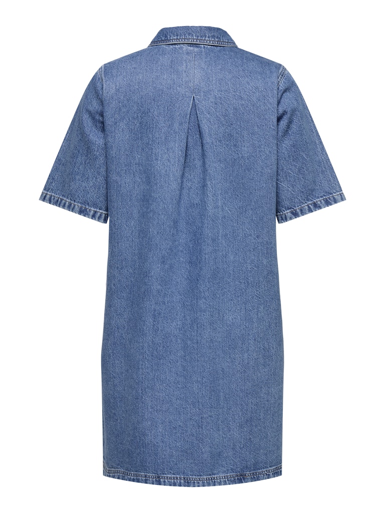Denne knee dress i denim kombinerer et klassisk look med komfort takket være dens regular fit og box-ærmer med korte ærmer. Kjolen har en skjortekrave og en halv-knap lukning, hvilket giver et stilrent og let anvendeligt design. Materiale blandingen på 80% bomuld og 20% genanvendt bomuld gør kjolen både blød og bæredygtig, samtidig med at den bidrager til at reducere tekstilaffald og bevare naturressourcerne.