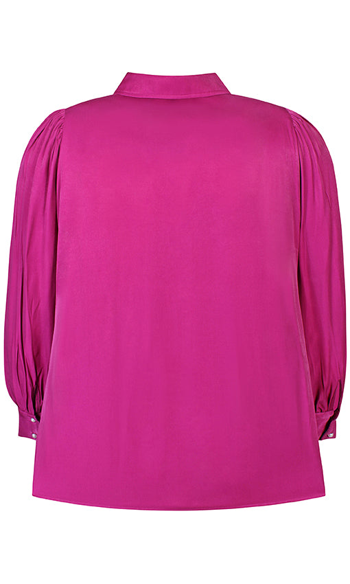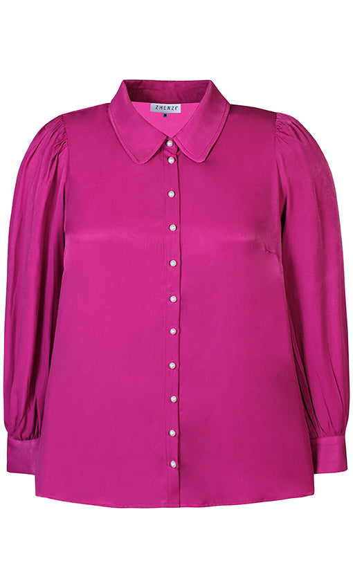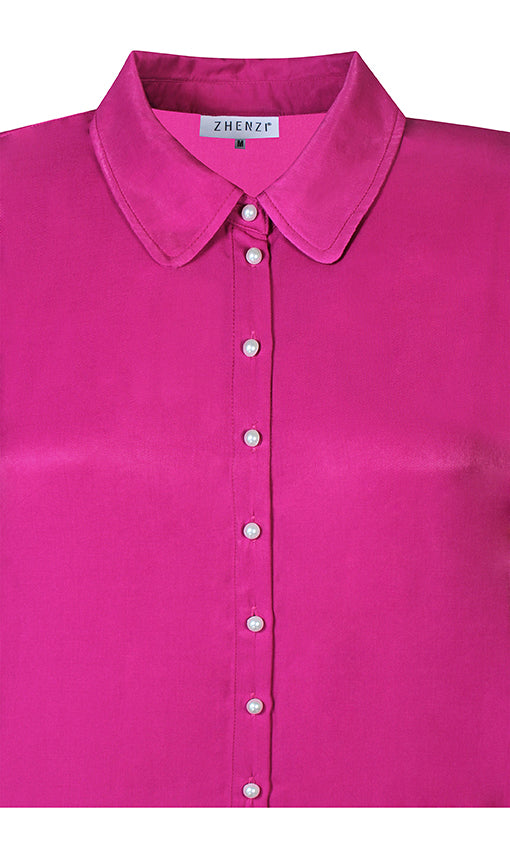 Helt vild skøn satin skjorte i flot fuchsia farve og hvide "perle look" knapper fra Zhenzi..