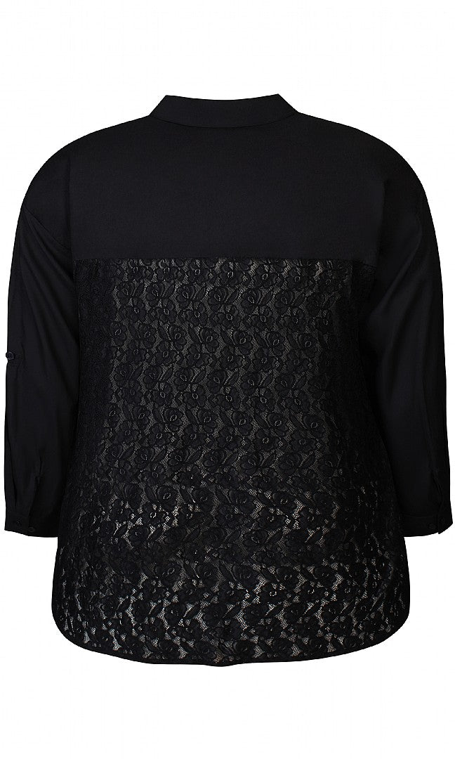 Den er med skjortekrave og så er den gennemknappet, den har lange ærmer som afsluttes med manchet, der er også et lille knapbånd til at holde ærmet oppe, og så har den, den her helt vilde skønne blonde ryg..