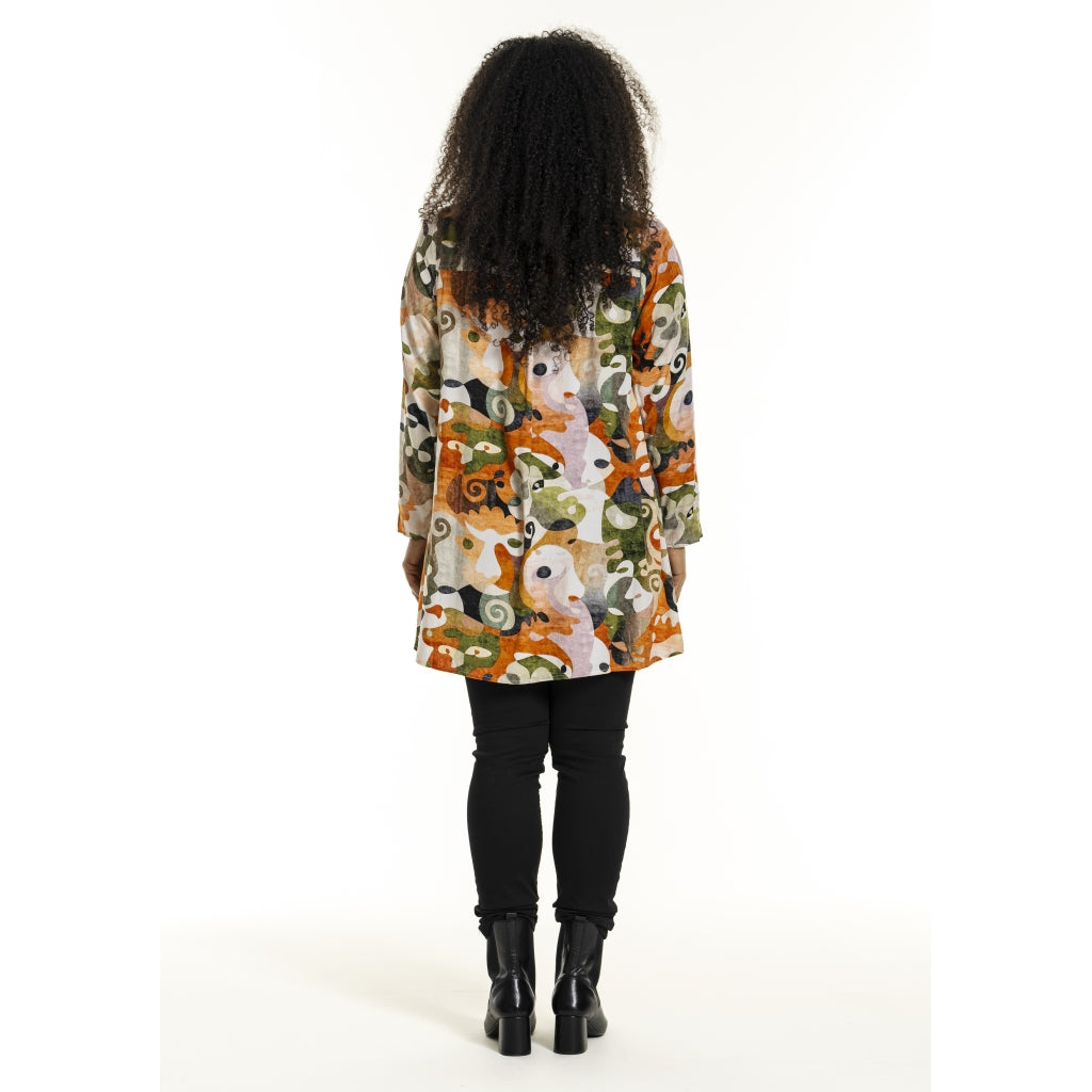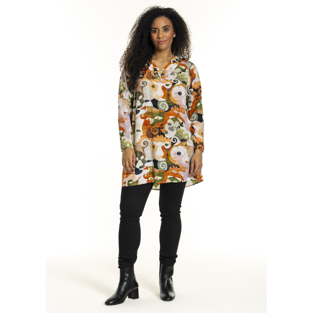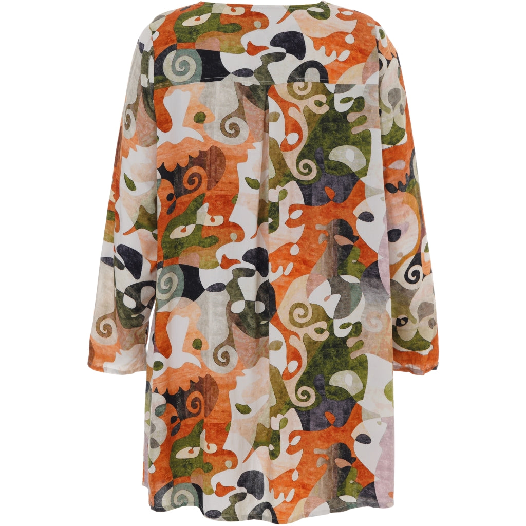 Farverig tunika med kunstnerisk og abstrakt tryk. Tunikaen har lange ærmer og V-udskæring med læg, der understreger V-detaljen.