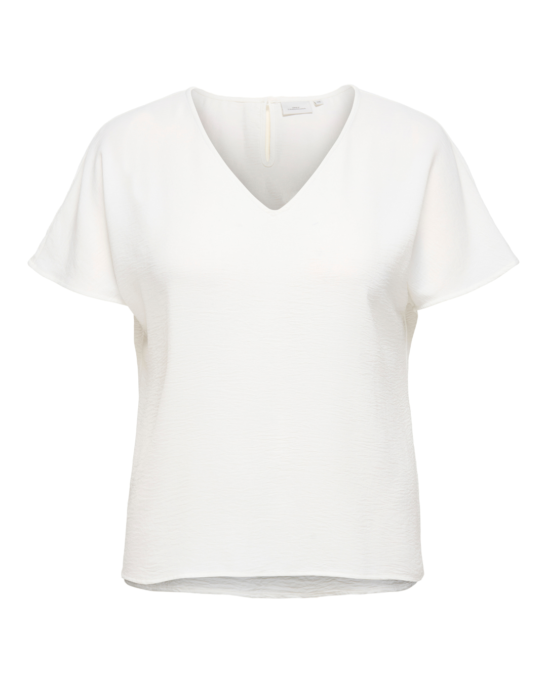 Blusen har V-hals, knaplukning bagpå i halsen.