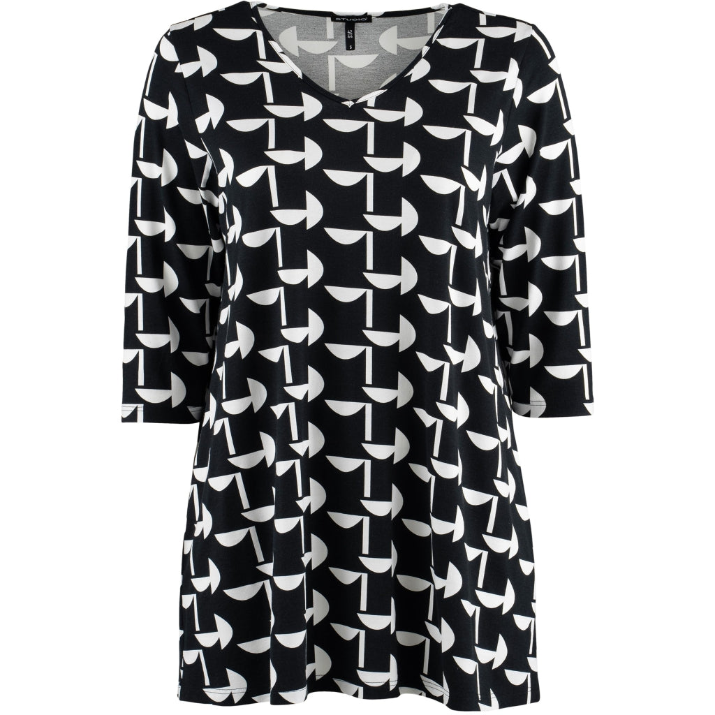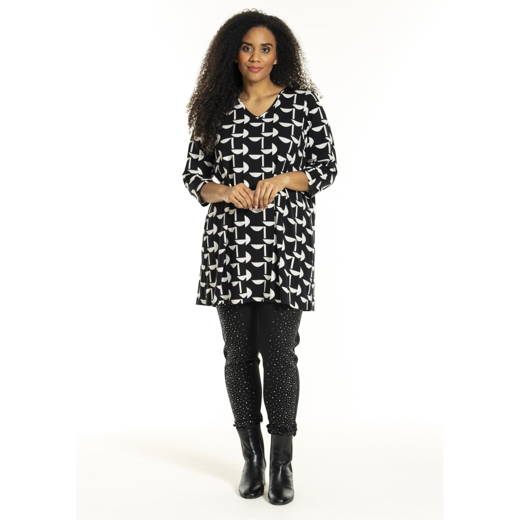 Enkel tunika i elastisk viskose, jerseykvalitet med hvidt grafisk print på sort baggrund. Tunikaen har V-udskæring og 3/4 ærmer.