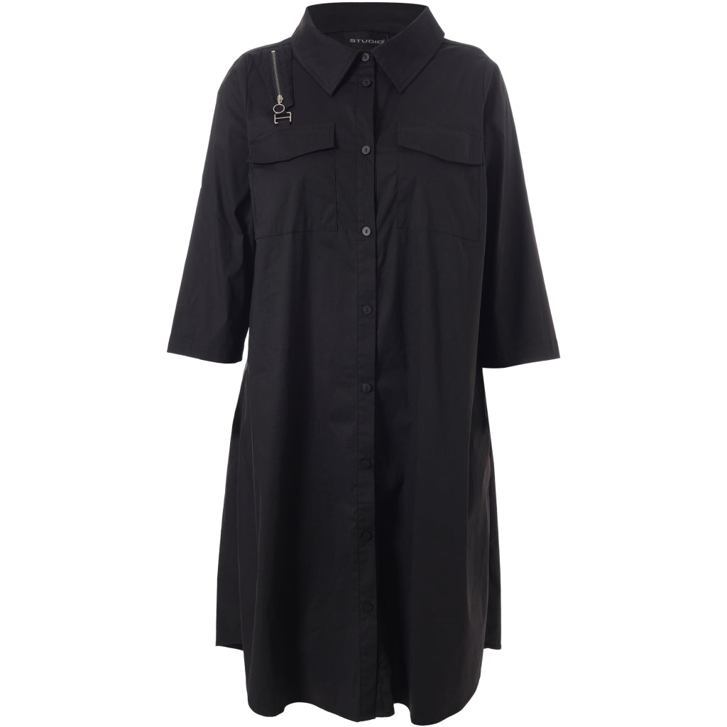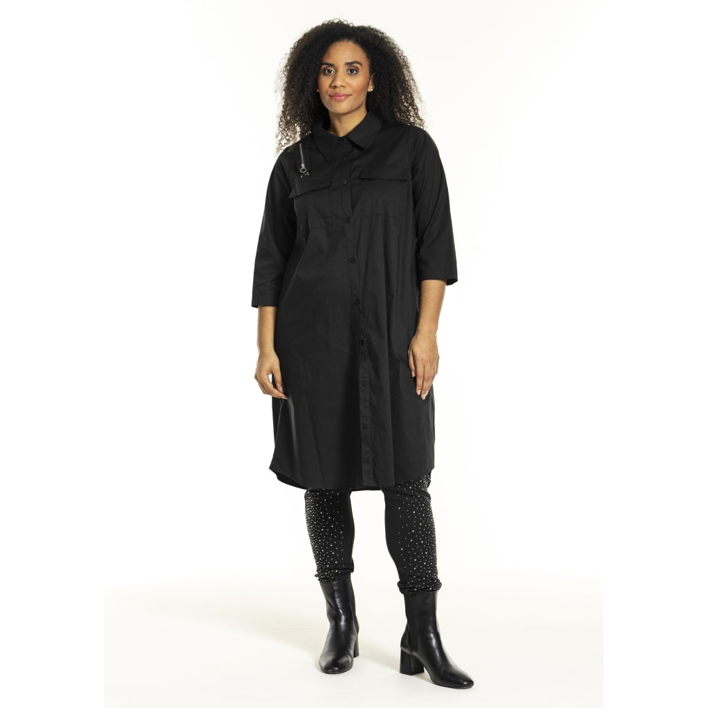 Fin, ensfarvet skjortetunika i elastisk bomuld-nylonblanding med fede detaljer. Stilen har en skjortekrave og fuld knapstolkning. Med 3/4 ærmer og brystlommer. Lynlås fra venstre skulder ned til brystlomme med spænde.