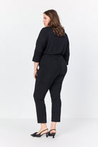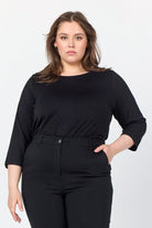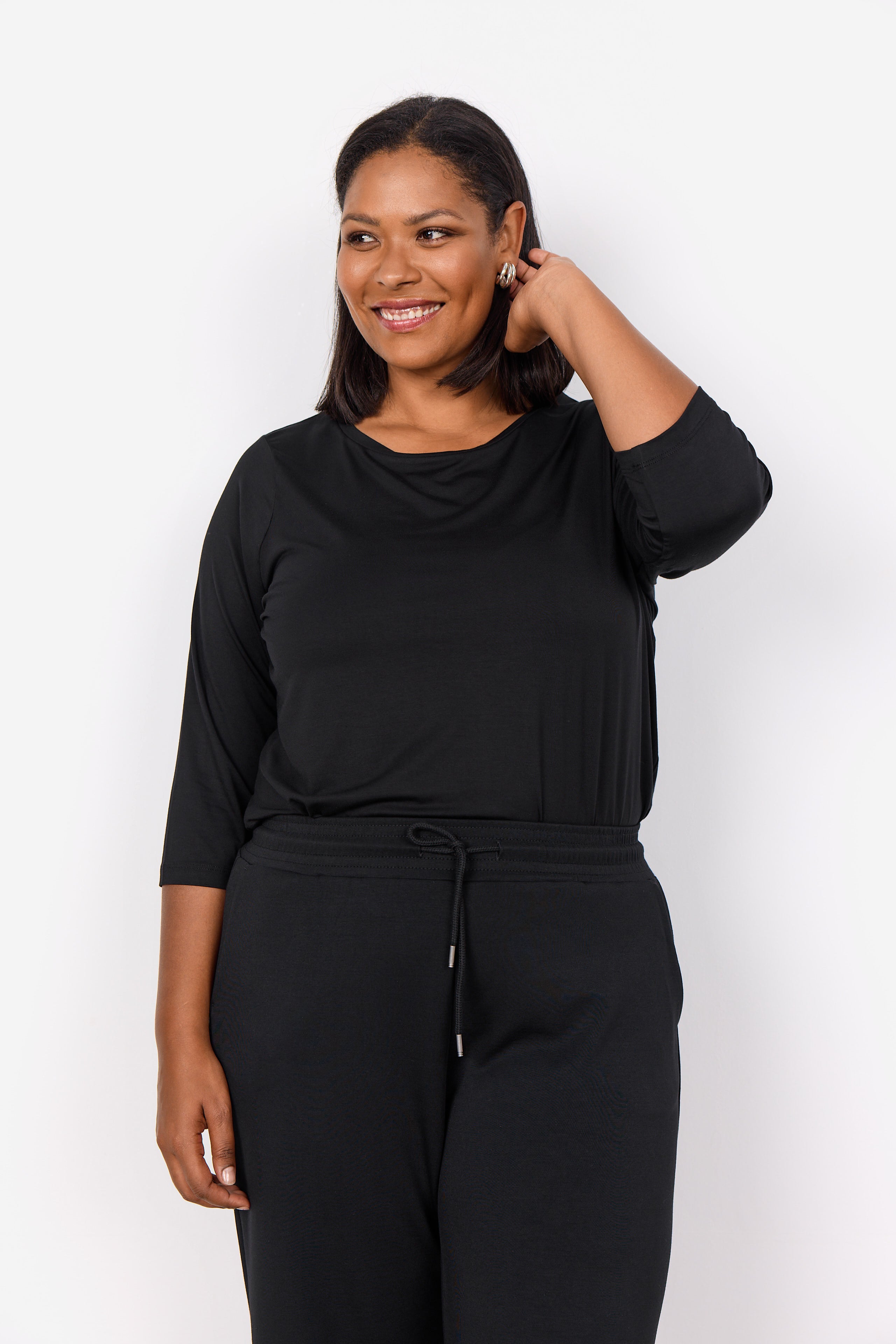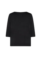 T-shirten har en rund halsudskæring, 3/4 ærmer og en løs pasform.