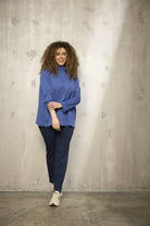 Smart og komfortabel bluse fra Zhenzi, designet i en flot blå farve med høj krave og knaplukning foran. Blusen har lange ærmer, løs pasform og små slidser i siderne, der giver et afslappet og moderne look. Den er fremstillet i en blød og strækbar kvalitet af 48% polyester, 45% viskose og 7% elastan, hvilket gør den behagelig at have på hele dagen. Perfekt til både jeans, leggings og mere elegante bukser.
