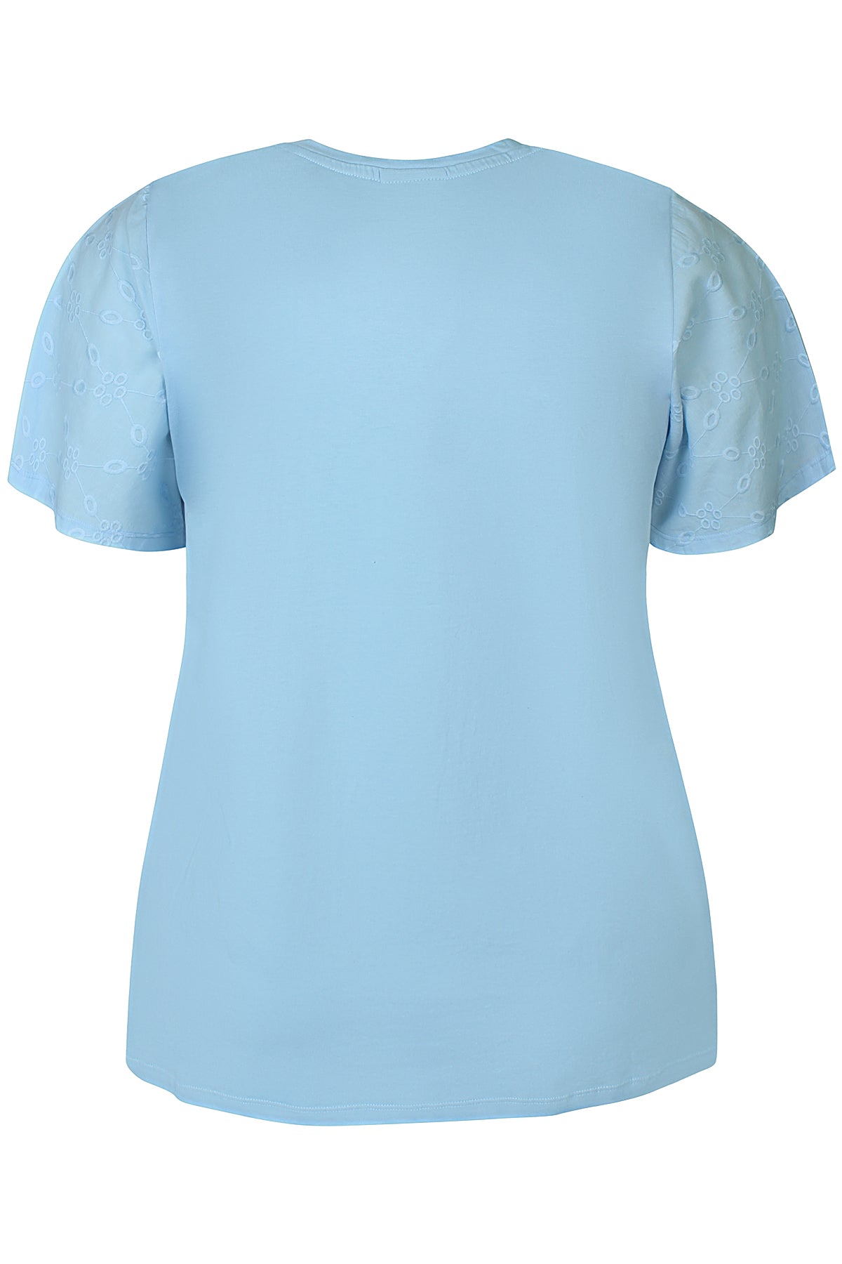 T-shirt med broderie anglaise, V-hals og kort ærme.