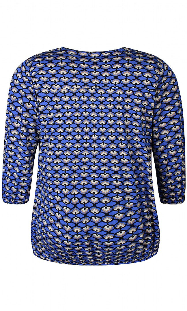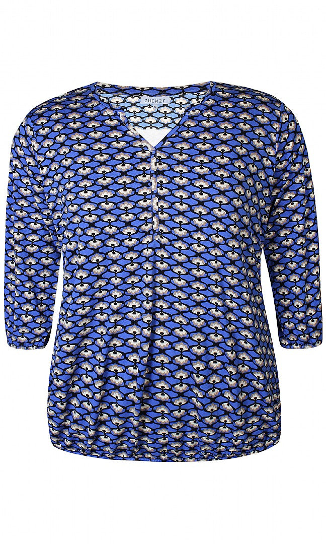Zhenzi blusen er en elegant og behagelig bluse i en smuk blå farve. Den har 3/4 lange ærmer med elastik i kanten, elastik i taljen og en V-hals.