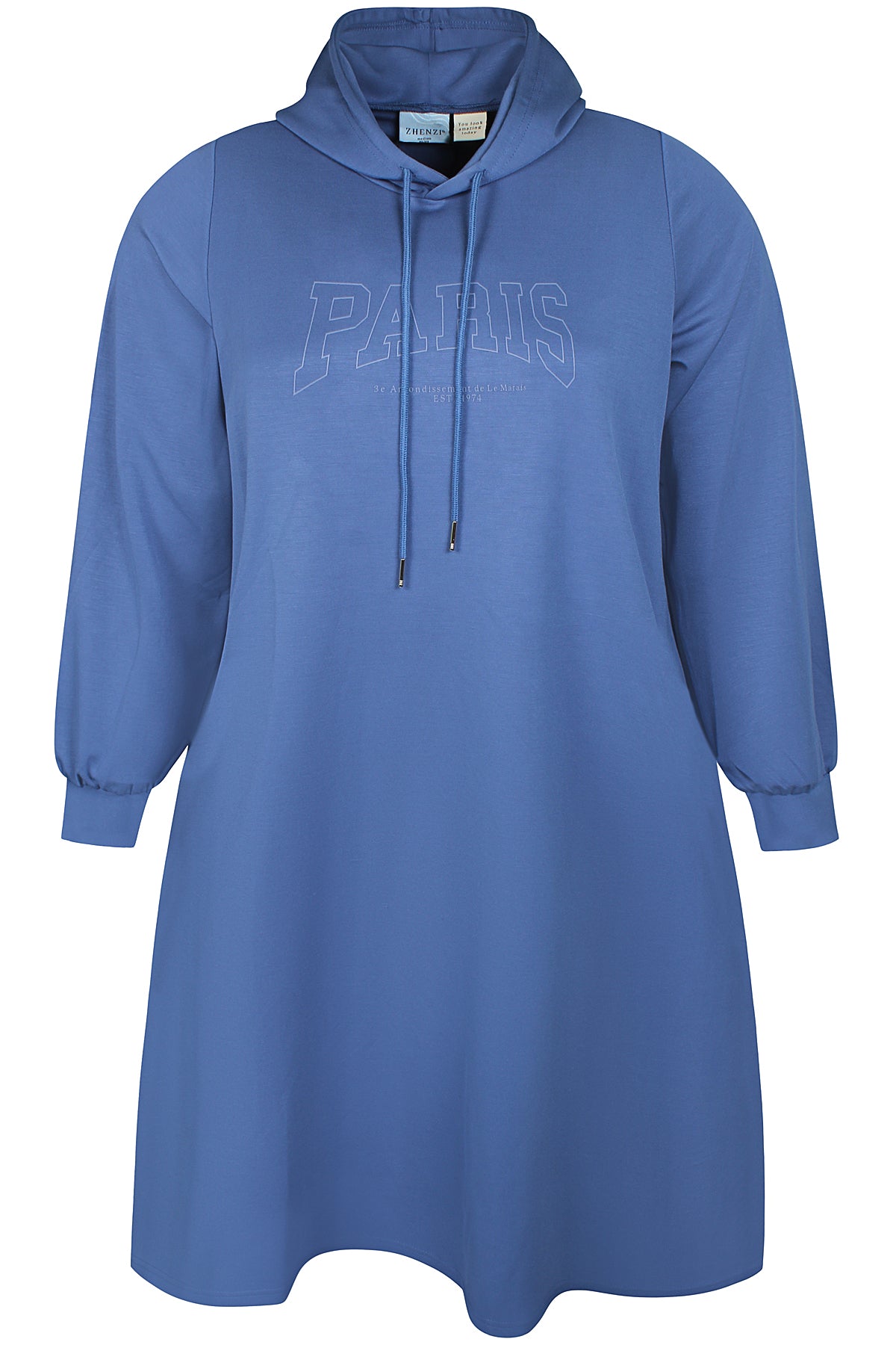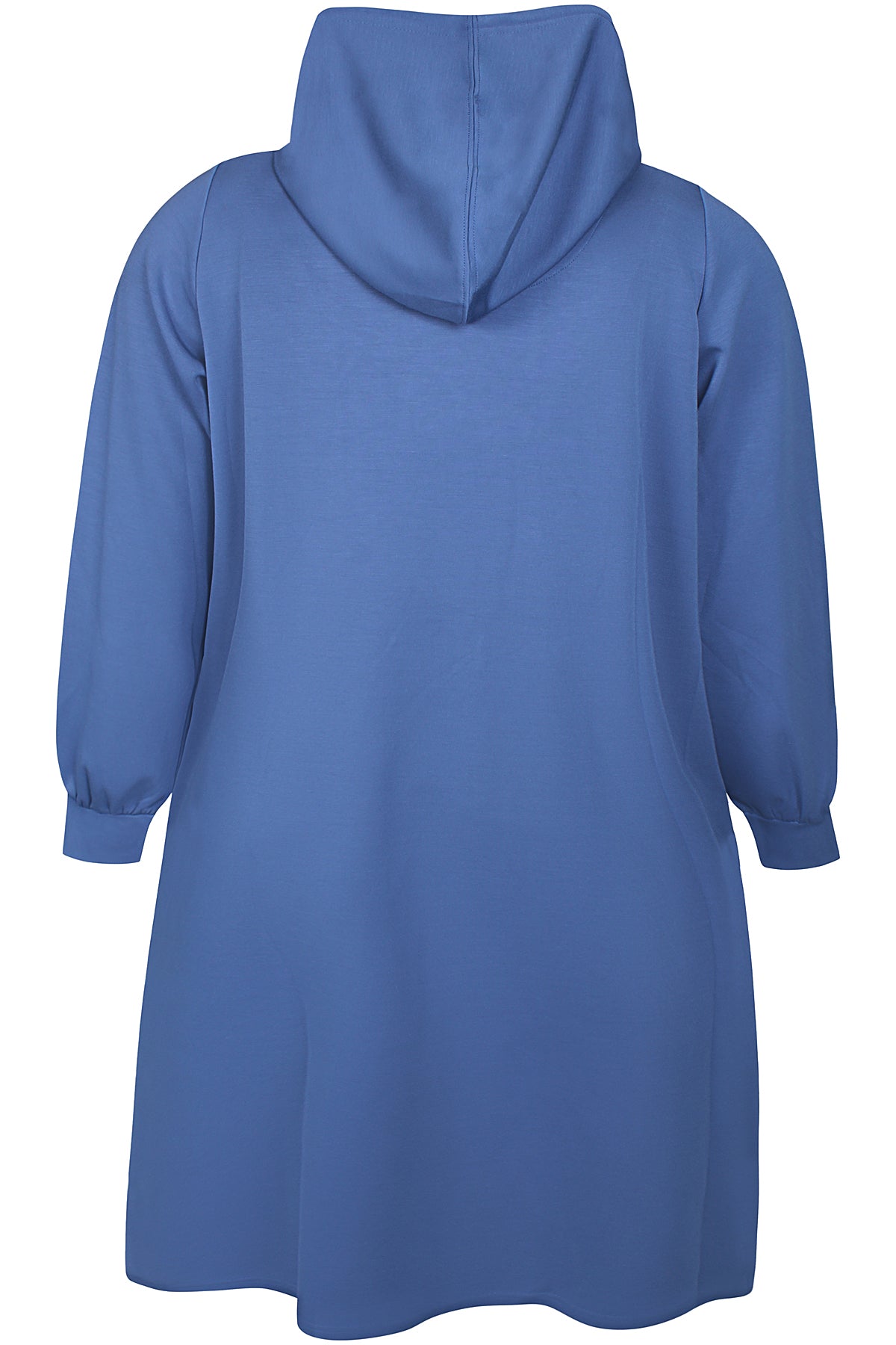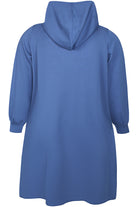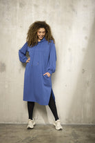 Blå Kjole fra Zhenzi i løs pasform sidder behageligt til og giver plads til bevægelse. Længden lander lige under knæet, og stoffet falder i en let drapering. Hætten giver halsområdet dækket og lange ærmer fuldender det afslappede udtryk; sidelommerne og sidesplitten gør det praktisk i hverdagen.