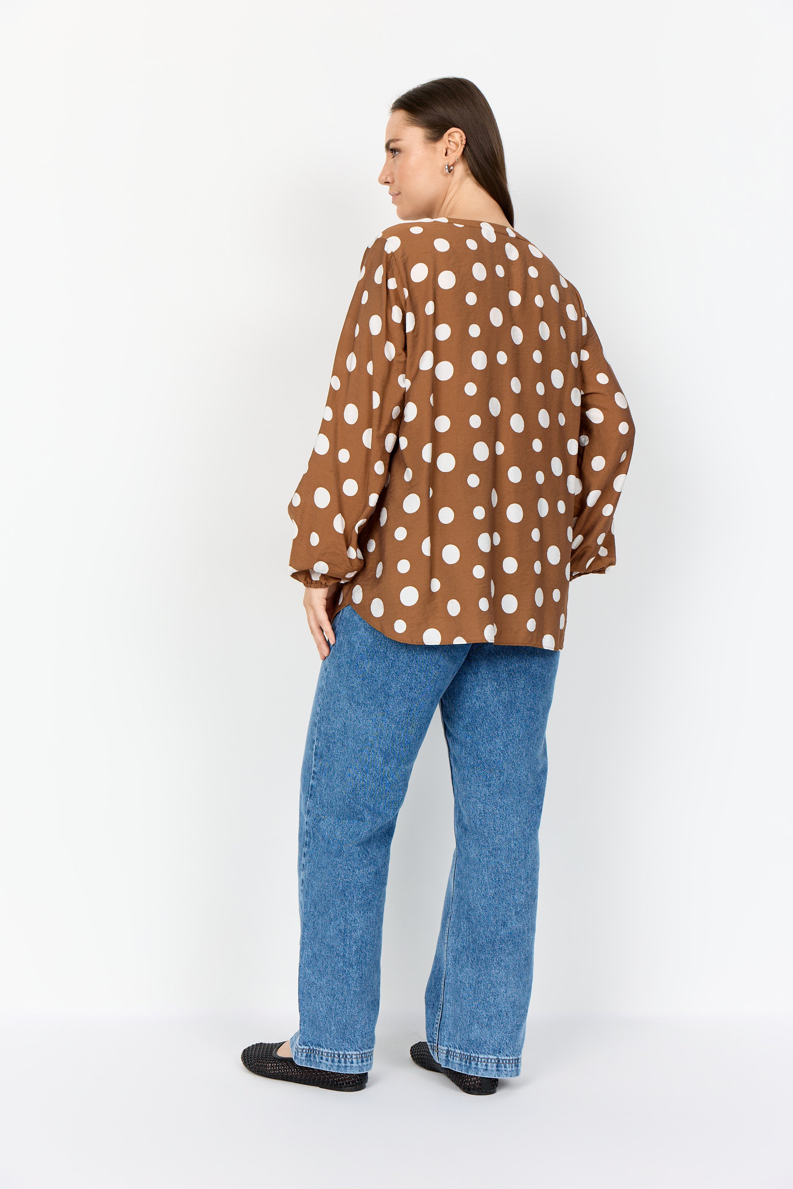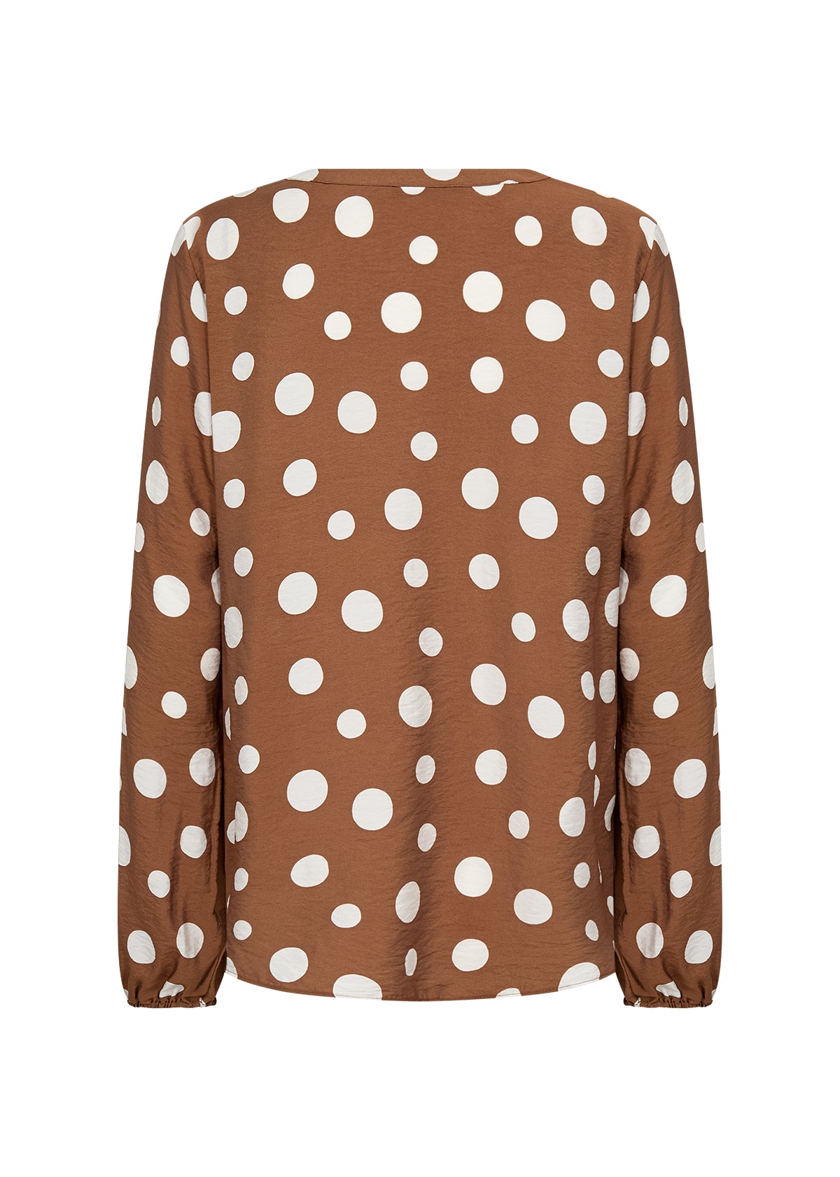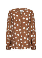 Blusen den har et elegant polkaprikket print, en delt halsudskæring og en knaplukning.