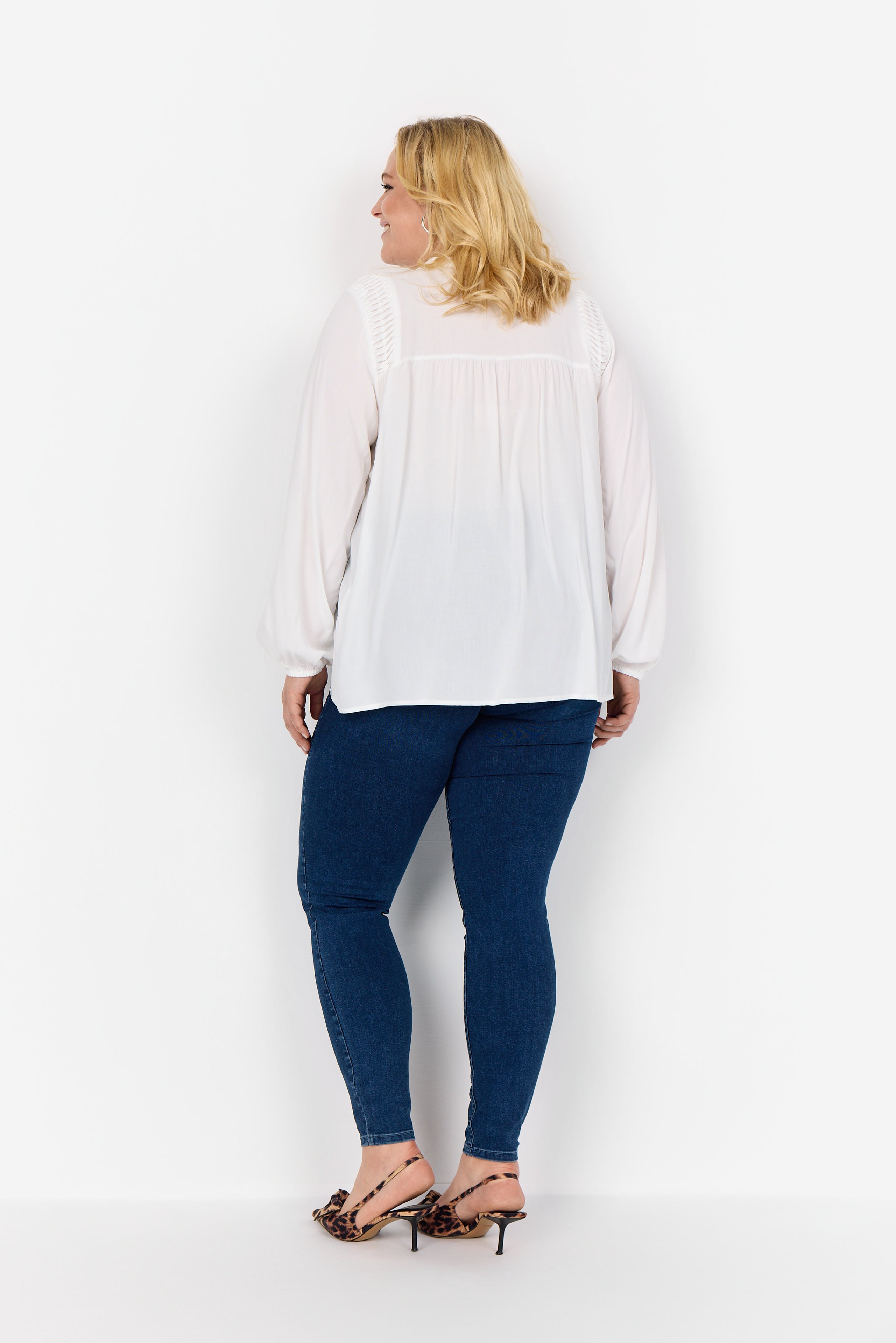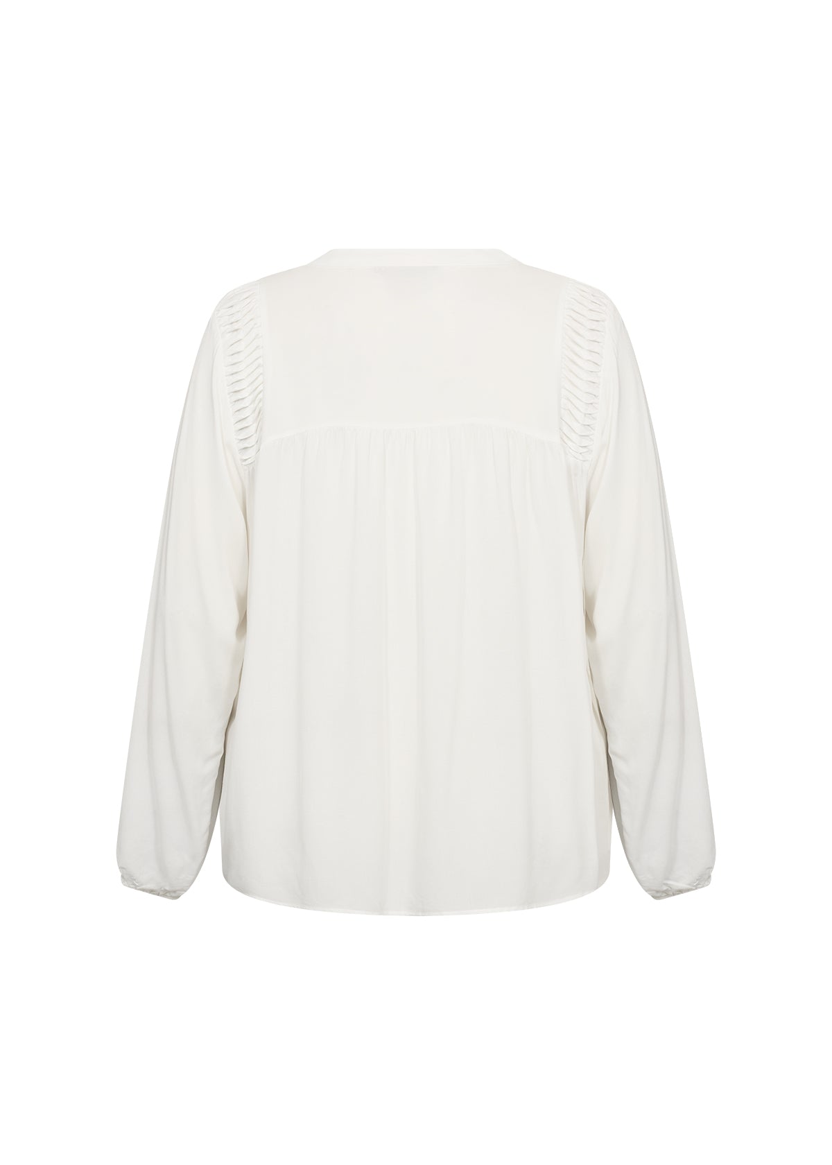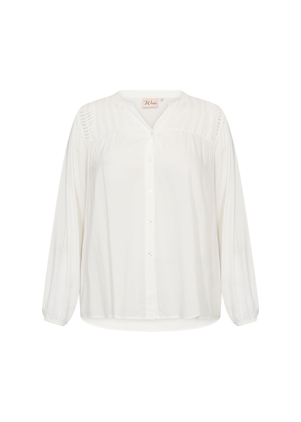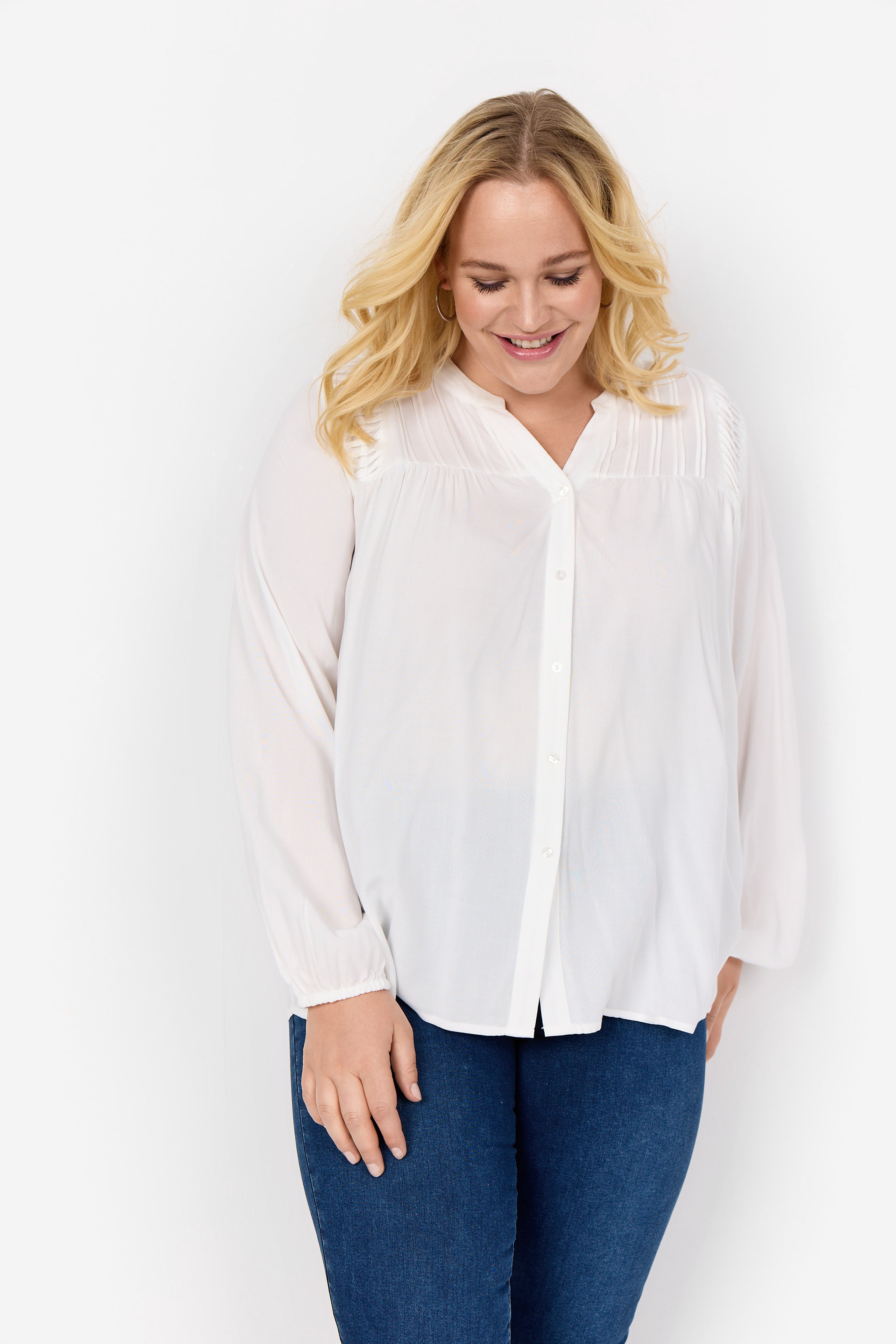 Blusen er gennemknappet med lange ærmer med elastik i kanten.