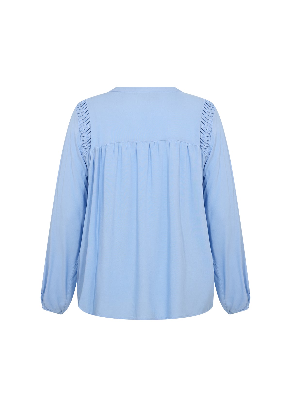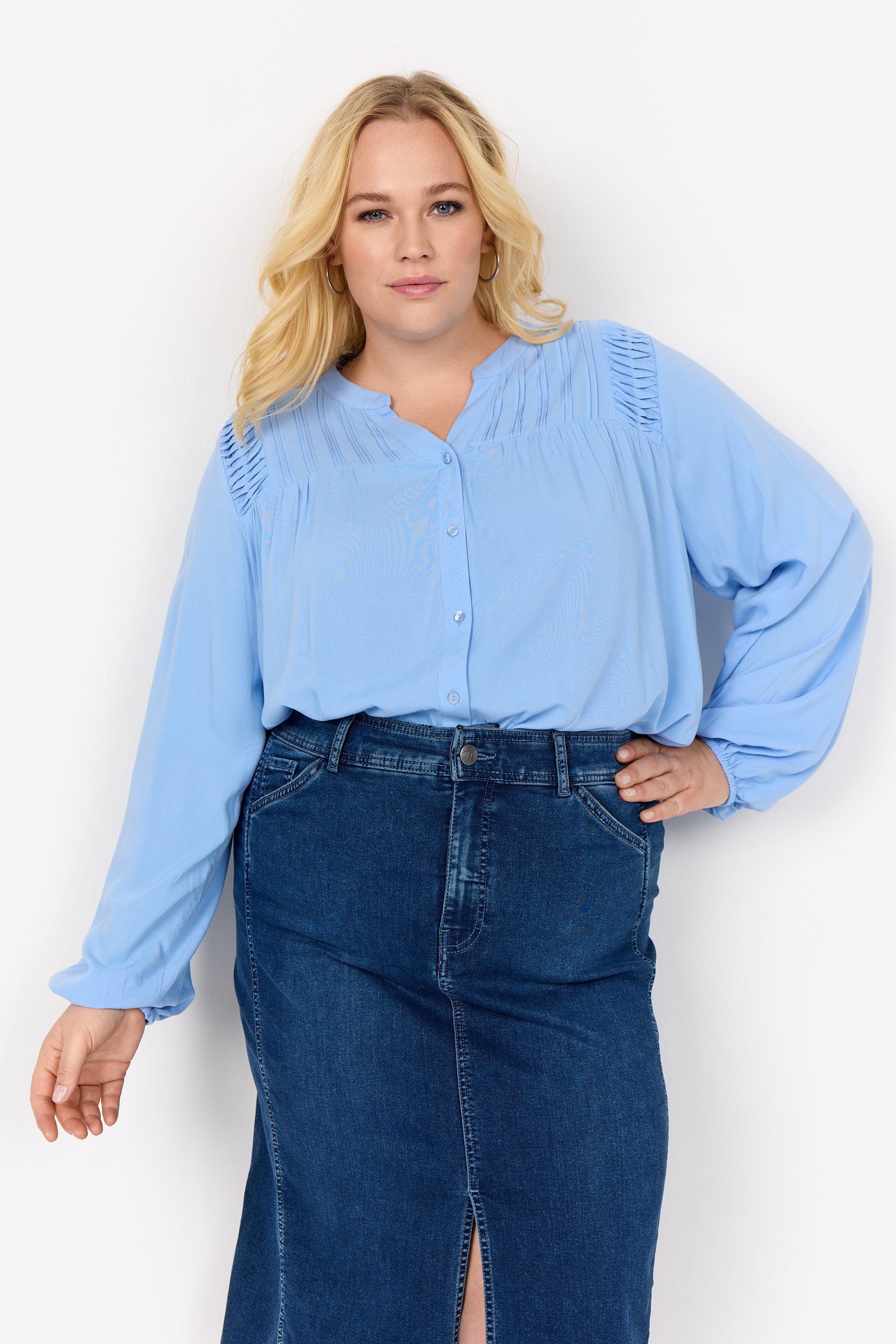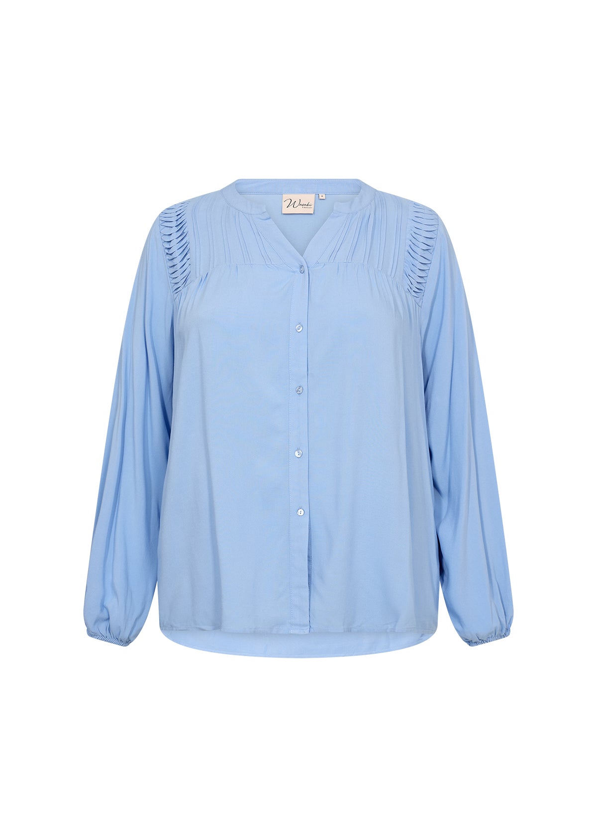 Blusen er gennemknappet med lange ærmer med elastik i kanten.