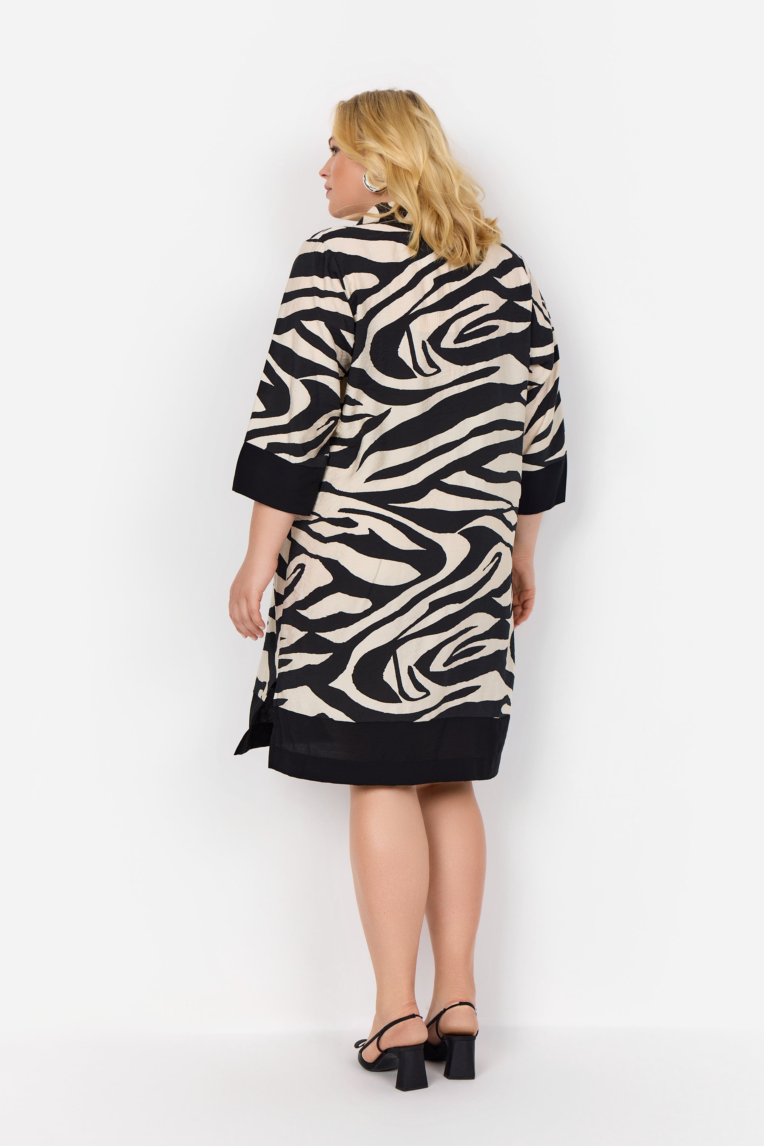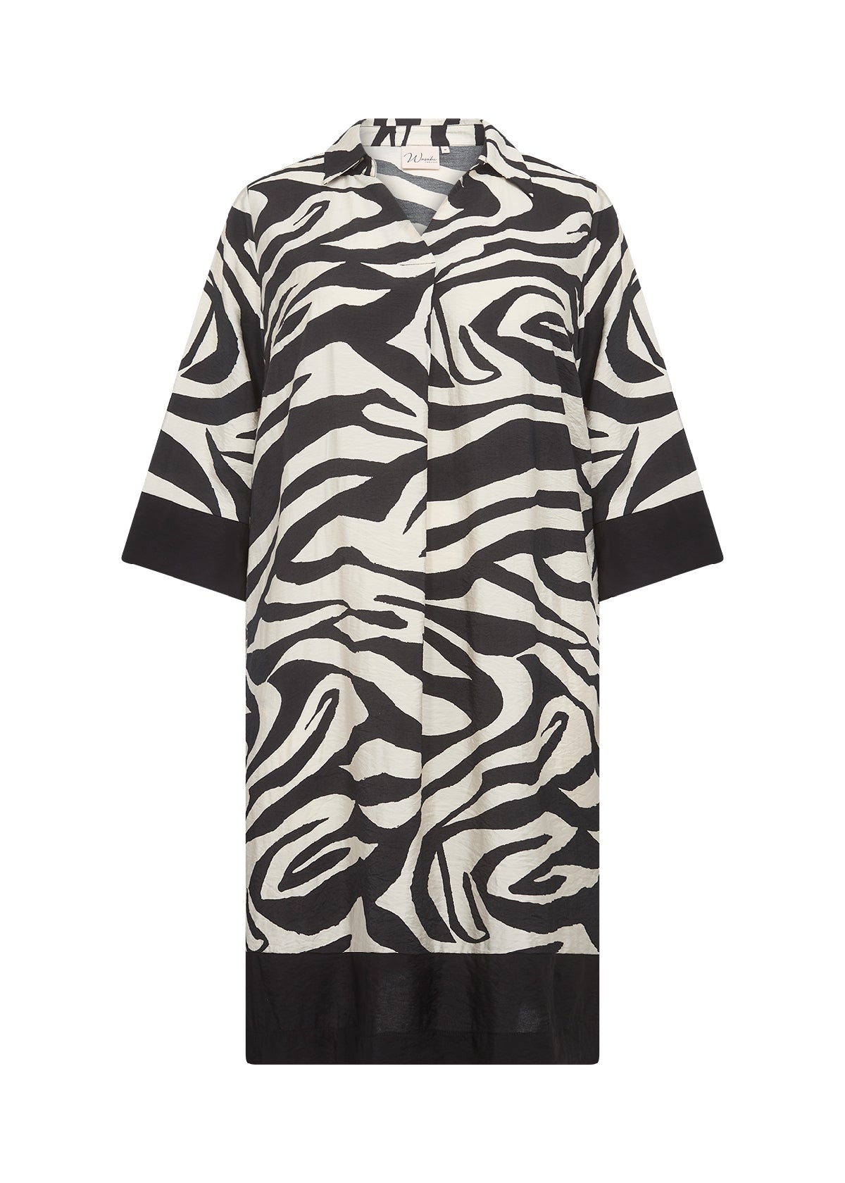 Denne kjole har et fint zebraprint med en klassisk krave og 3/4-lange ærmer.