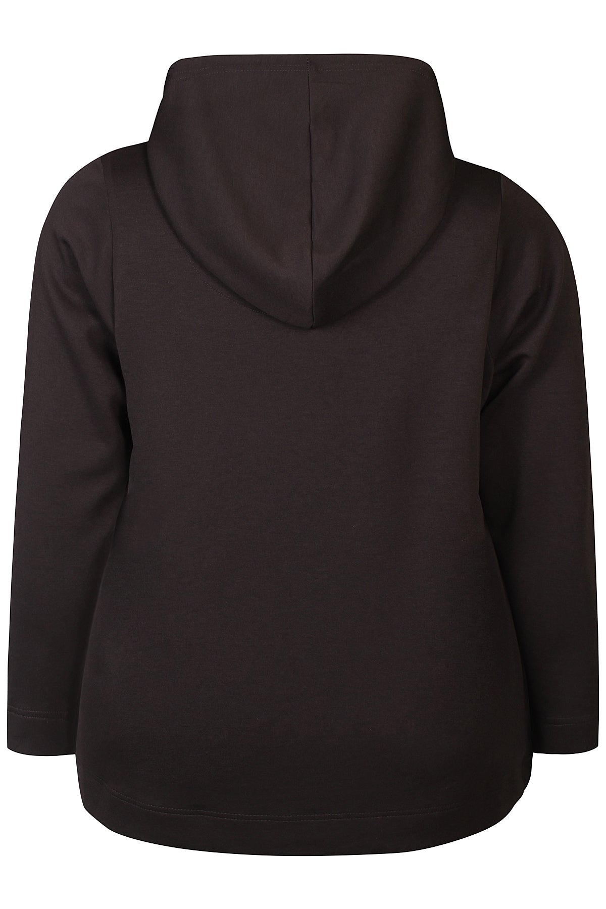 Hætte med snøre i halsen, diskret tryk på forsiden.