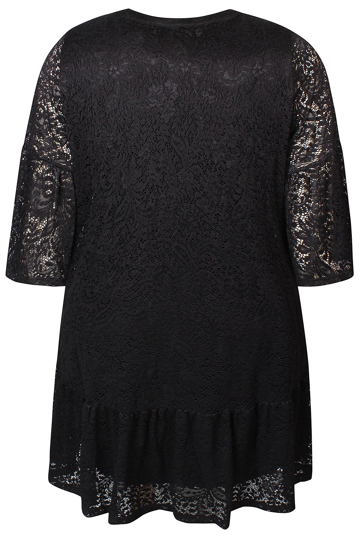 3/4 ærme med flæse, ærmet er gennemsigtigt.
