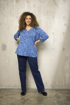 Blusen har V-hals og går ud i A-facon. 3/4 Langt ærme med elastik i kanten. S 42/44 Brystmål... Læs mere og se produktmål