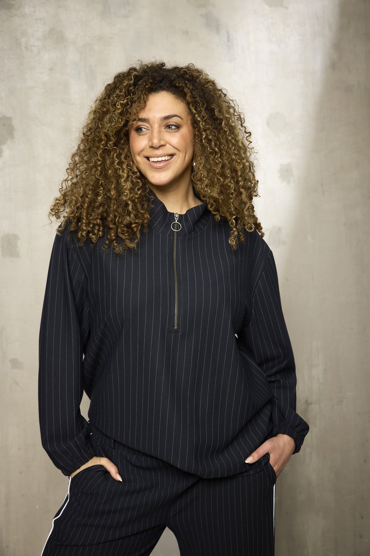 Flot stribet pullover, evt. sammen sat med bukserne som passer til. Høj hals med lynlås ned foran. Lange... Læs mere og se produktmål