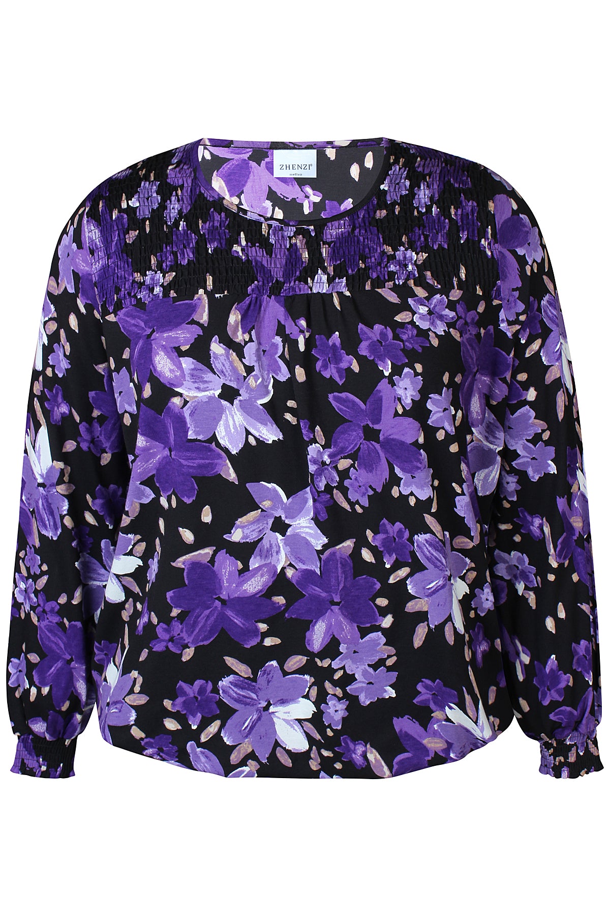 Bluse med lange ærmer og elastik i taljen.