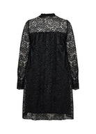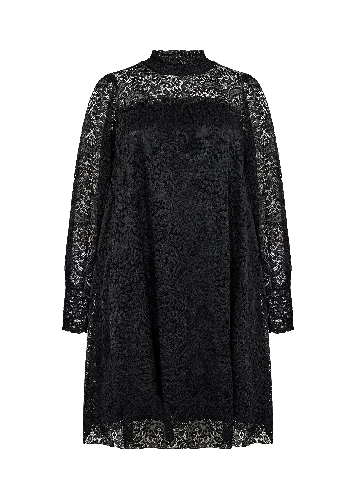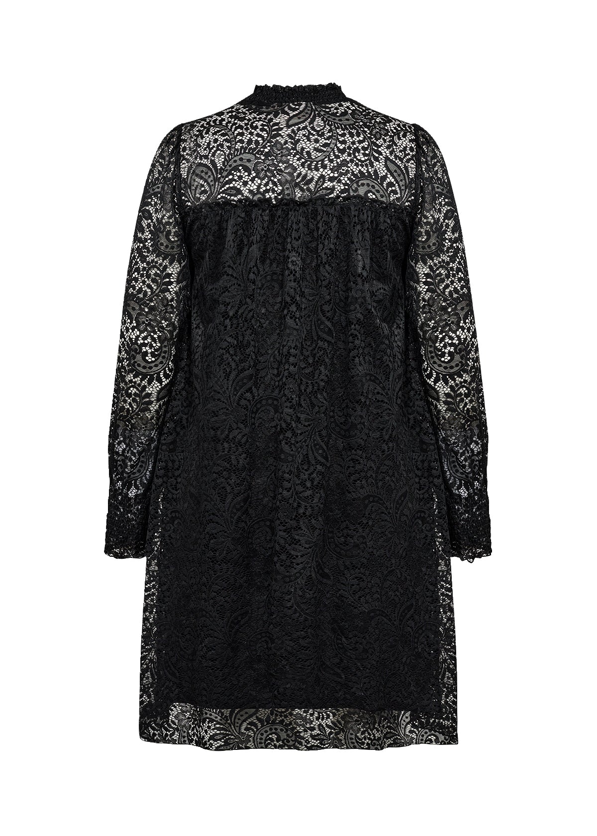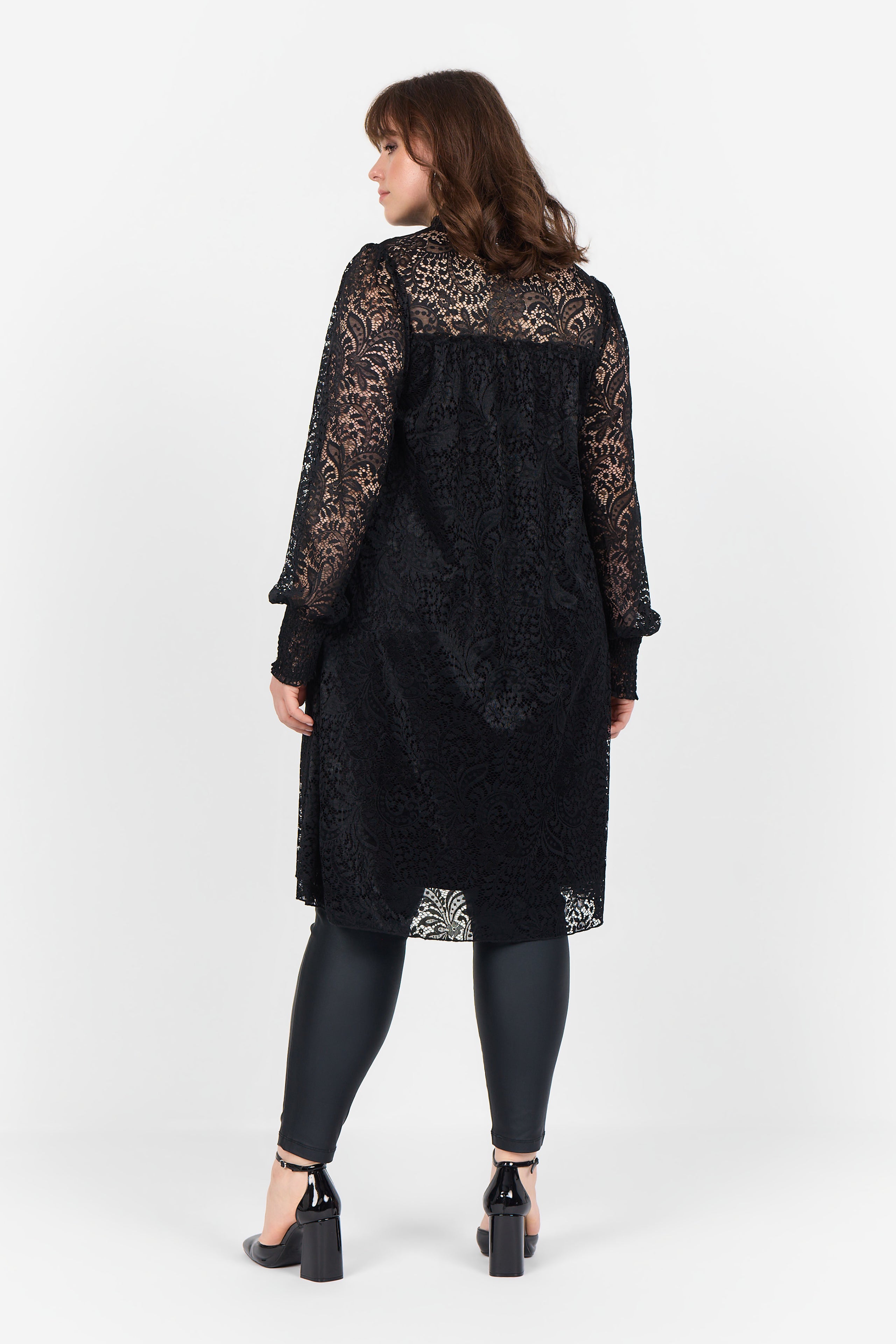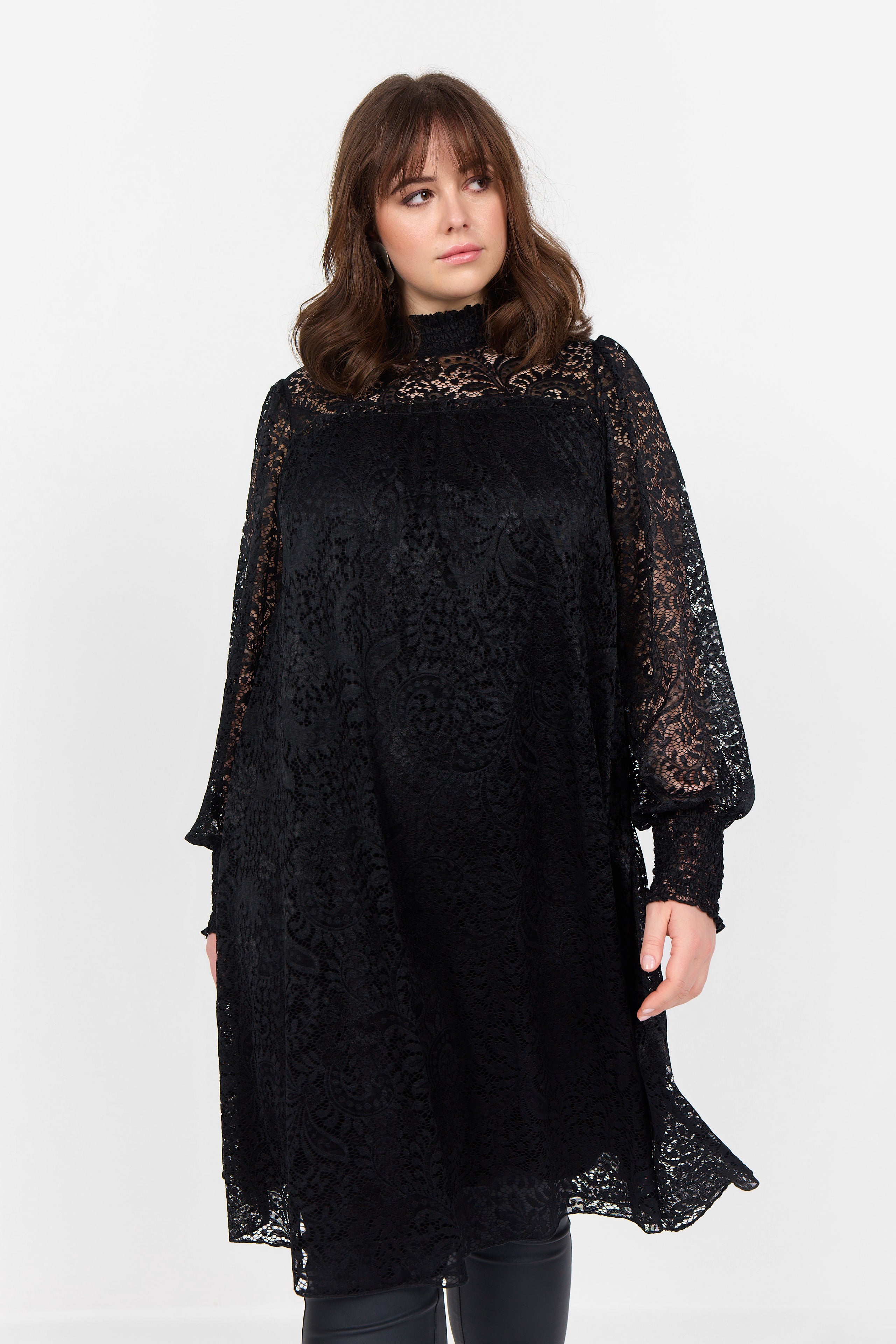 Kjolen har en høj halsudskæring, lange ærmer, en løs pasform og et smukt blondemateriale.