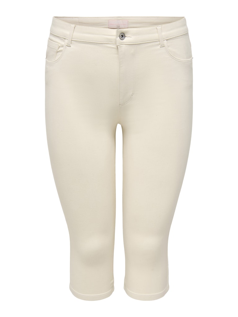 Dejlige denim knickers fra ONLY Carmakoma. Skønne tætsiddende knickers med alle de gode "five-pocket jeans" detaljer og et lidt råt look. Lukkes med knap og lynlås. Store lommer og bæltestropper.