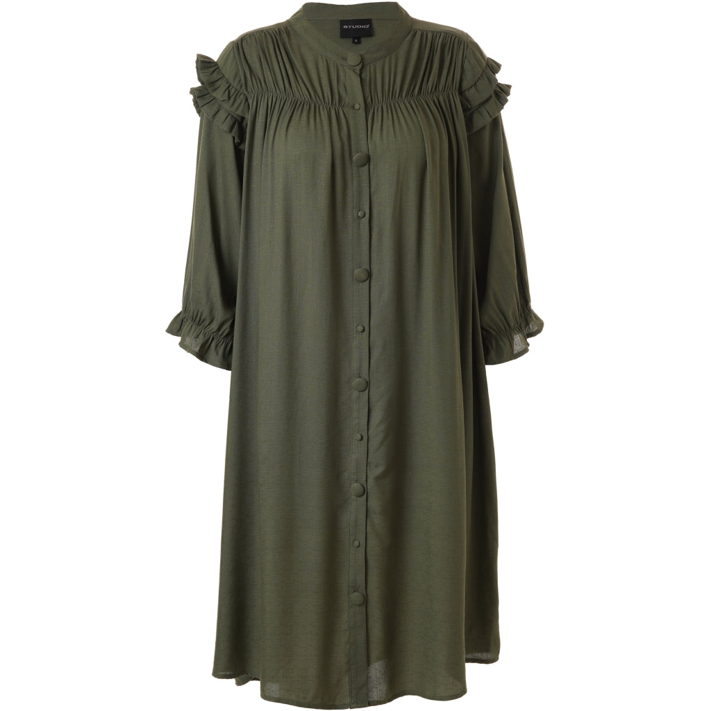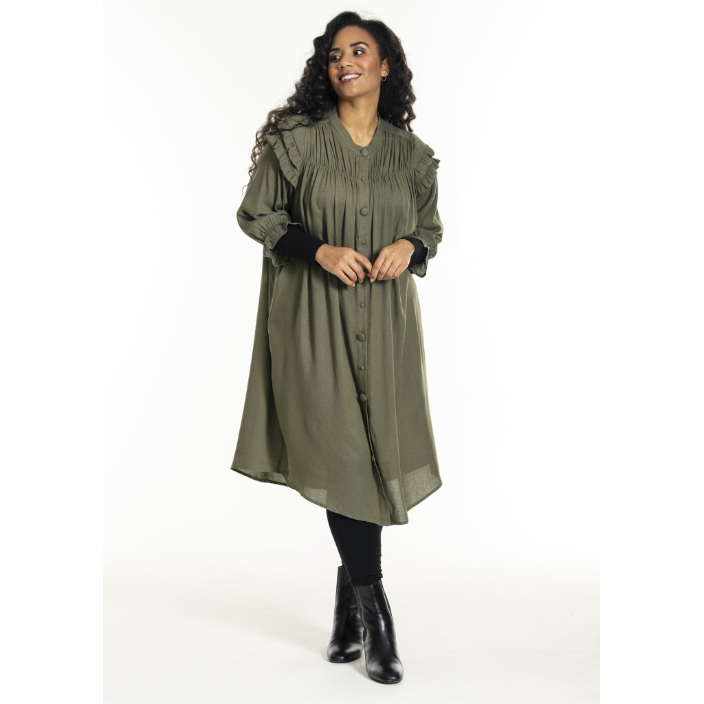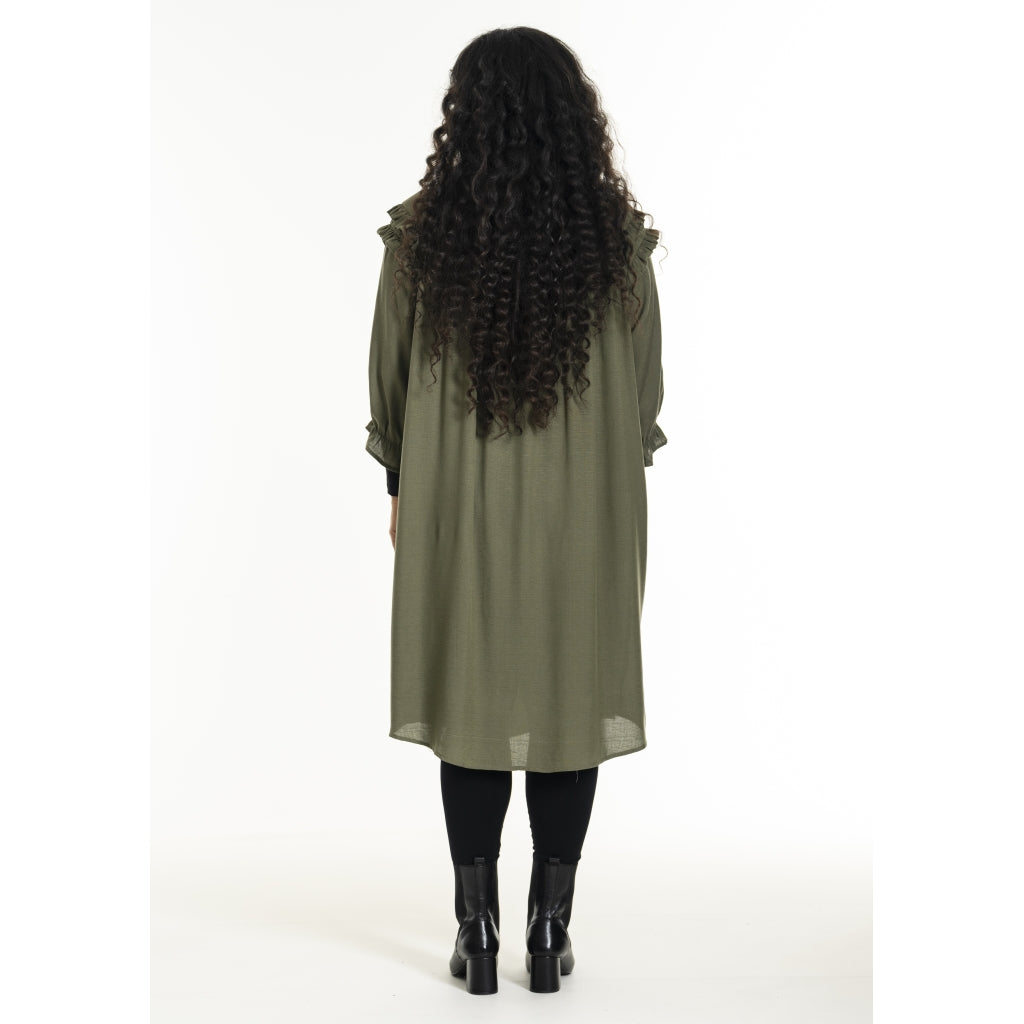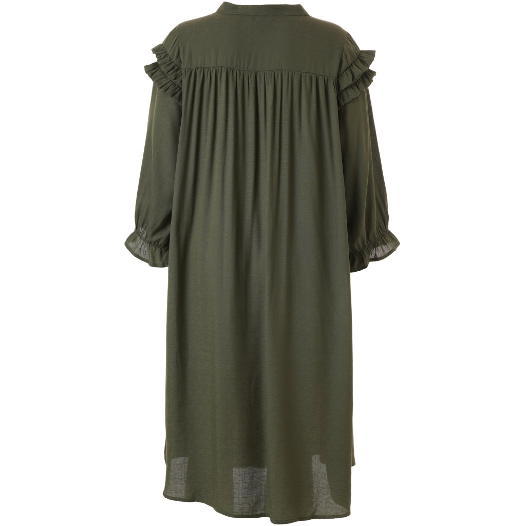 Fin, ensfarvet kjole i 100% viskose med lækre detaljer. Bærestykke foran og bagpå med rynker i stoffet. Lange ærmer med dobbeltlags flæser rundt om skuldrene.